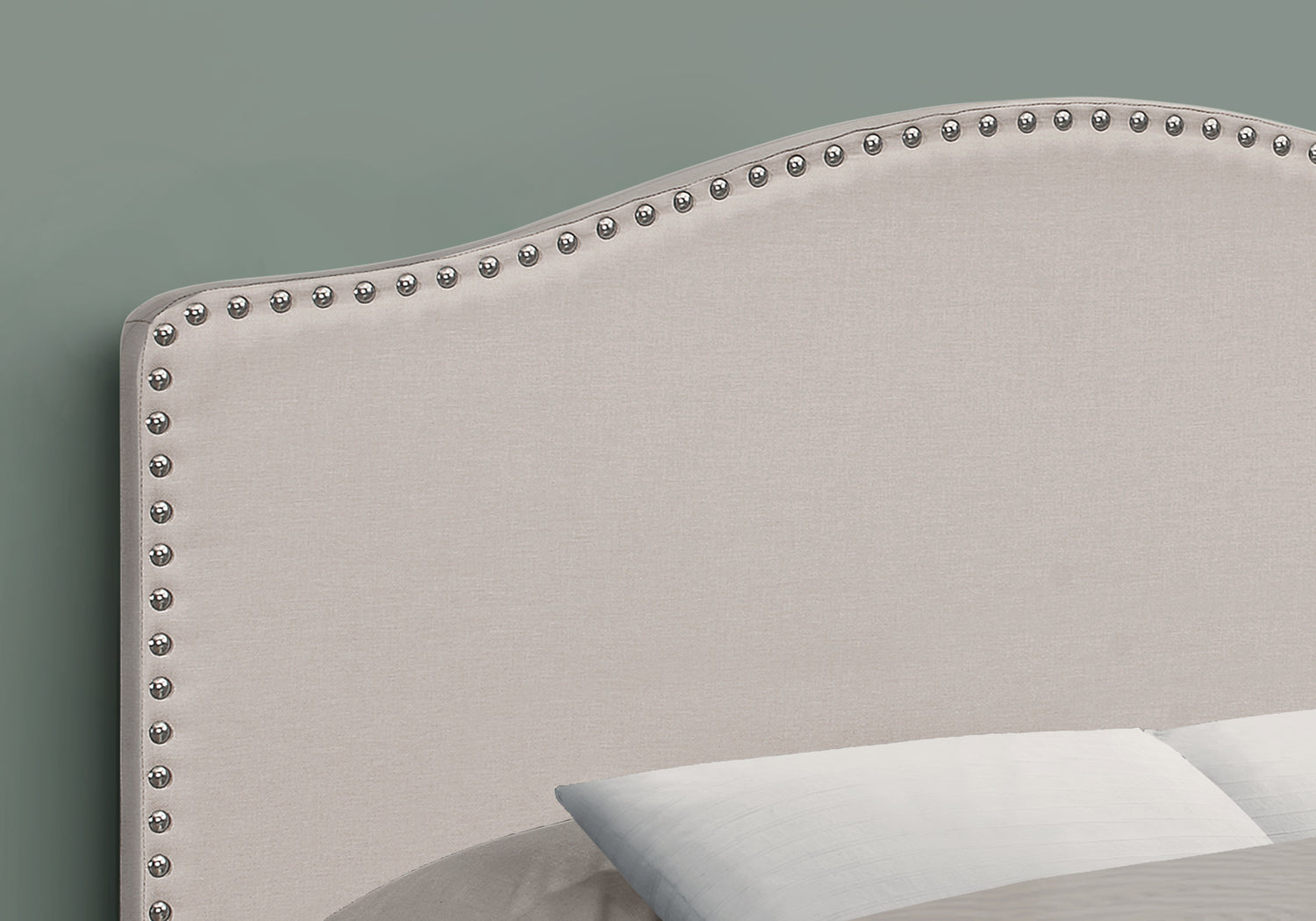 Combining modern materials and a classic silhouette, this upholstered headboard panel in a beige linen-look fabric brings timeless style to any bedroom. Chrome-finish nailheads create an eye-catching frame around the gently arched top and straight sides. Upholstered with extra padding and smooth-to-the-touch fabric, this headboard panel provides an ultra-soft feel for a comfortable night's sleep. Streamlined and compact, this headboard adjusts easily to your desired height with any new or existing bed frame and is ideal for any size bedroom.