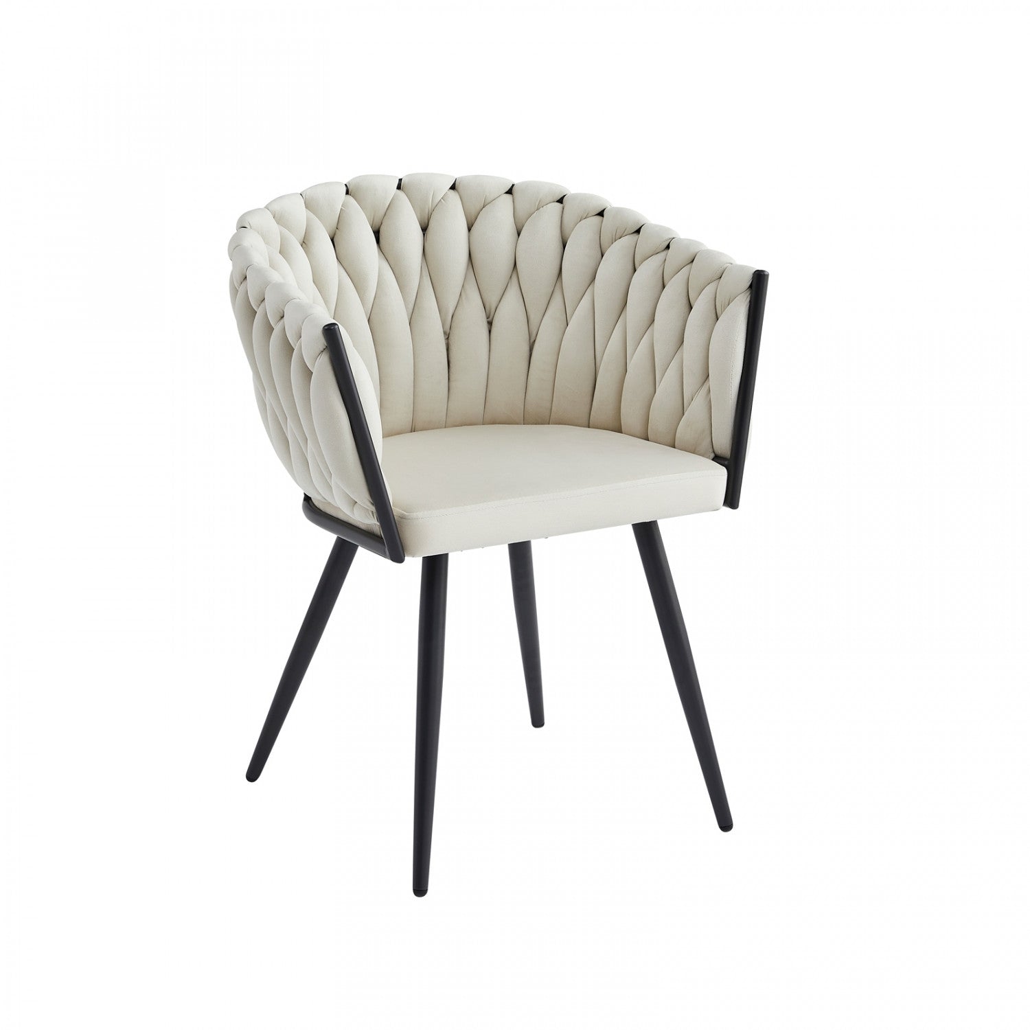 Introduce a little artistry to your dining room with the exquisite Hildy Collection. This stylish arm chair is a fantastic way to spruce up your modern dining area thanks to its contemporary low profile. The barrel design is cloaked in soft beige velvet upholstery that weaves around the frame with a unique braided effect. Despite its artistic appearance, the contoured back and arms are padded with foam, as is the seat, providing ample cushioning and support. Metal framing and angled black powder-coated metal legs guarantee long-lasting durability, allowing the Hildy to effortlessly blend practicality and elegance as it becomes your dining room’s new statement piece. Other colours also available.