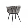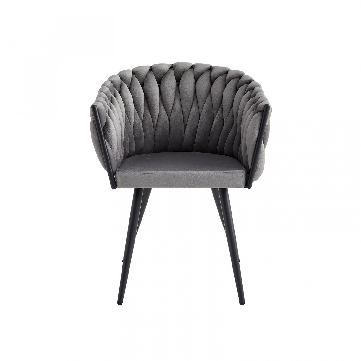 Introduce a little artistry to your dining room with the exquisite Hildy Collection. This stylish arm chair is a fantastic way to spruce up your modern dining area thanks to its contemporary low profile. The barrel design is cloaked in soft grey velvet upholstery that weaves around the frame with a unique braided effect. Despite its artistic appearance, the contoured back and arms are padded with foam, as is the seat, providing ample cushioning and support. Metal framing and angled black powder-coated metal legs guarantee long-lasting durability, allowing the Hildy to effortlessly blend practicality and elegance as it becomes your dining room’s new statement piece. Other colours also available.