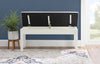 This functional storage bench is a beautiful complement to almost any room in your home. Not only can it go in your hallway, bedroom or living room, but it can also be paired with a dining table for extra seating. It opens to reveal hidden storage and a soft close hinge for easy access to your blankets, gloves, and other accessories. The comfortable, upholstered cushion features a solid light grey fabric made from a crosshatching construction giving it a heathered effect. As an added bonus, this fabric is performance grade, meaning it is made to resist and release stains, moisture, and odors. This item pairs perfectly with the matching side chair. Some assembly required.