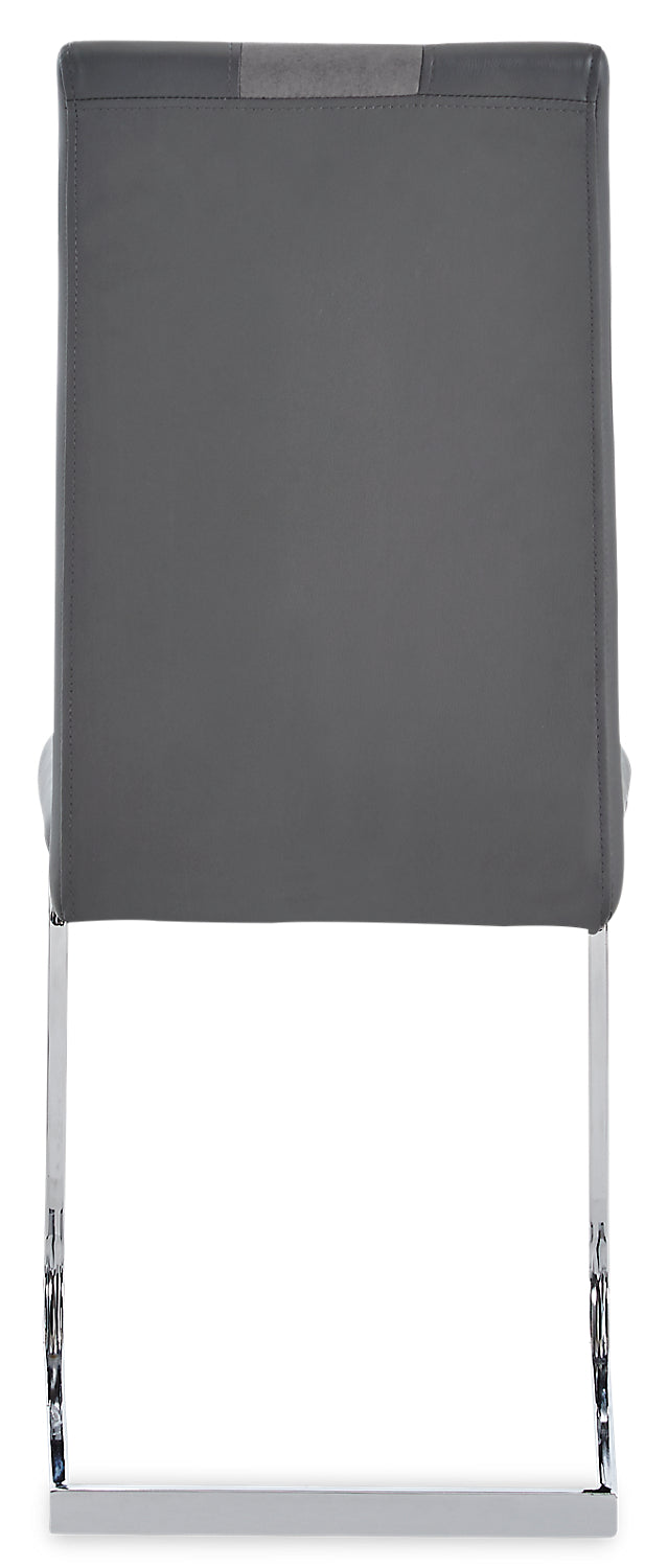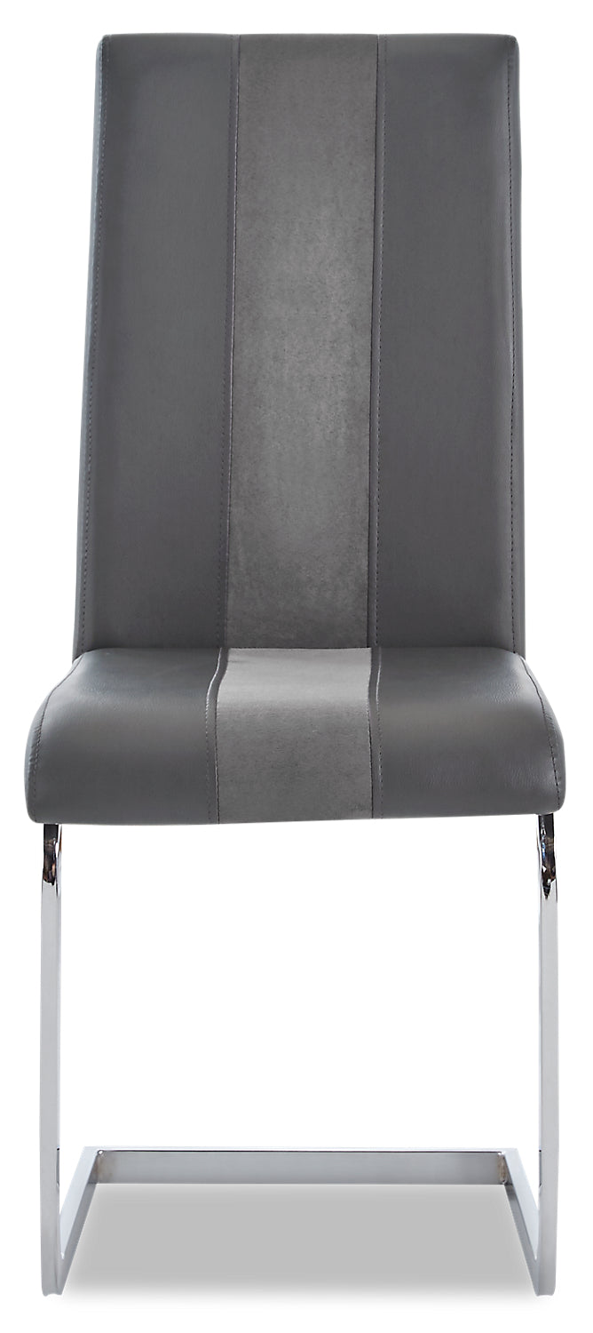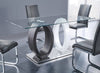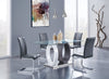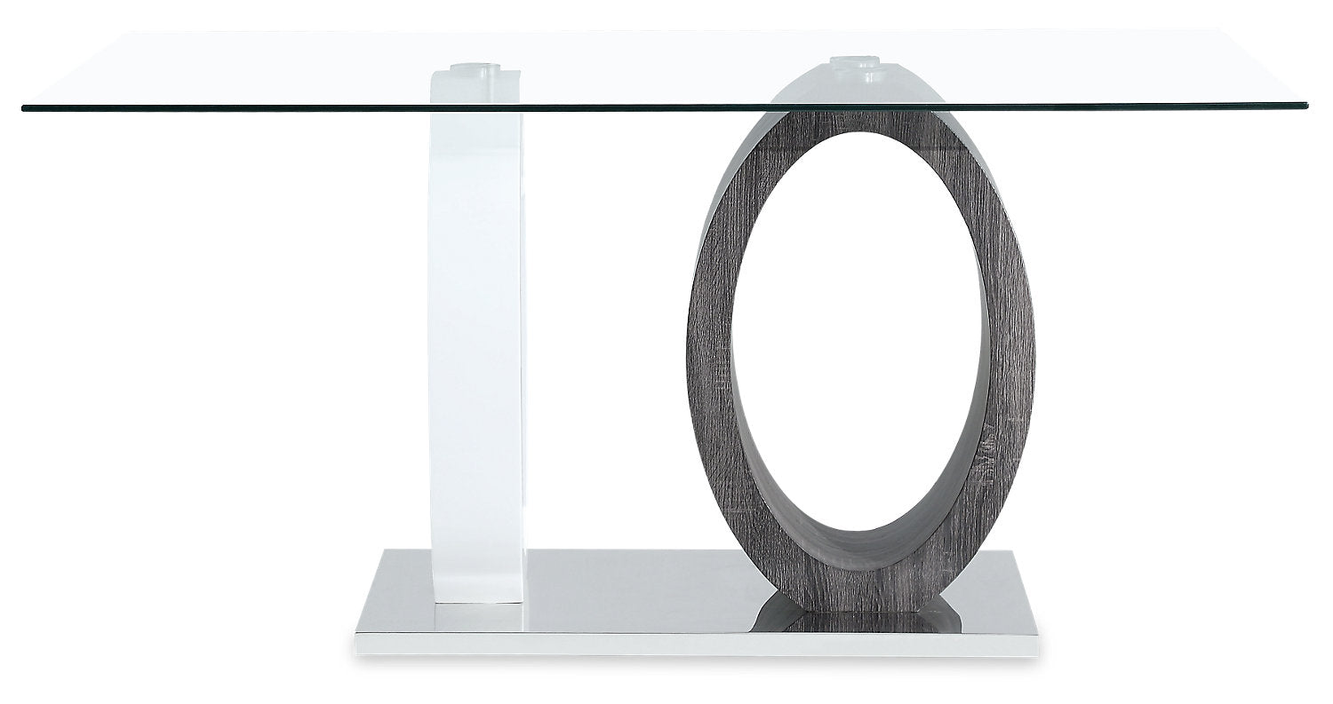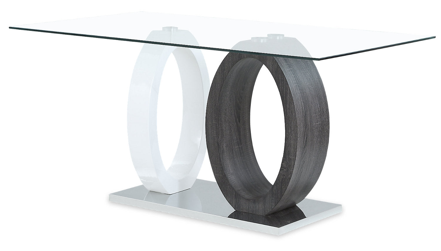 Shake up your dining room expectations with this strikingly modern Jaye five-piece dining table. A sheet of clear, durable tempered glass rests on a pair of two-tone wooden ovals in place of a central column. Finished in white and grey MDF wood, these open ovals add a splash of modern design to your room while keeping your dishes generously supported. Faux leather wraps the chairs’ seats and backrests with a look that contrasts light and dark grey tones. High-density foam makes sure you'll stay comfortable from appetizers through dessert. Invite the Jaye in for dinner, and make your dining space the talk of the town.