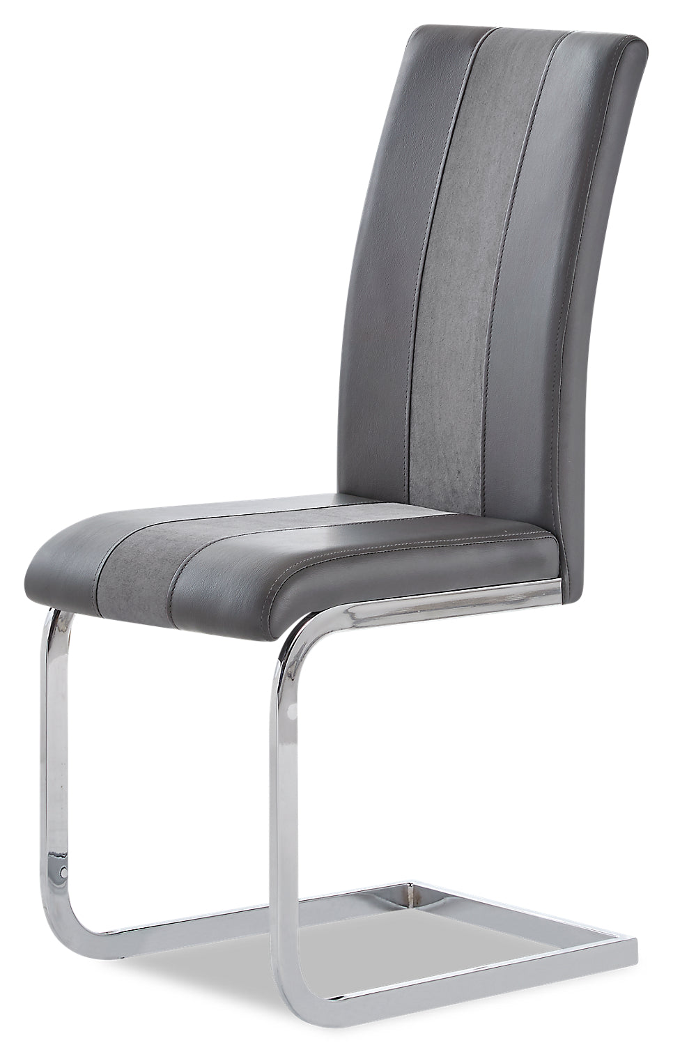 Accent Details | A pair of ovals made from grey and white wood makes up the pedestal of the table. A lighter stripe of grey fabric runs down the centre of the chair. |