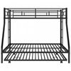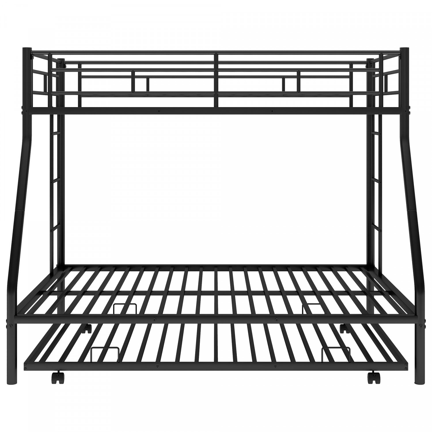 The bunk bed is the perfect all-in-one sleep solution for growing families or shared rooms. Featuring a durable steel frame, it includes a twin-over-full design plus a twin trundle for extra guests. Full-length guardrails and ladders on both sides ensure safe and easy access. The trundle features four wheels (two lockable) for smooth, secure operation. No box spring is needed thanks to the strong metal slats. Its black finish and compact footprint make it a stylish and practical addition to any room.