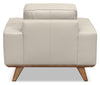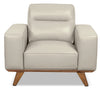Clean and uncomplicated, this Kai chair is an impressive example of retro and modern styles brought together. Track arms and simple shapes come together to create an updated mid-century modern design you can admire. Meanwhile, silvery-grey genuine leather seating offers a sleek and luxurious place for you to relax. High-density foam pads the seat and back of this chair for your comfort. Resting on oak-finished wood legs, this stunning Kai chair will add elegance and flair to your living space.