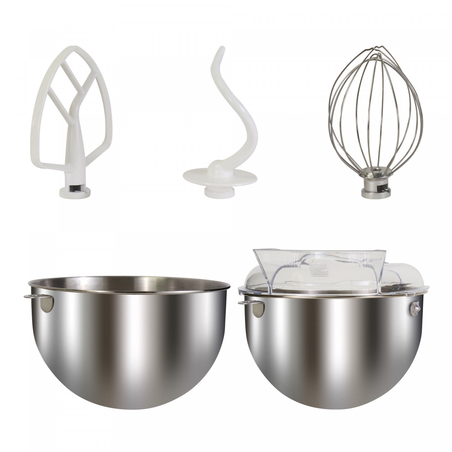 This Product Includes | Mixer power base; 2 x stainless steel bowls (5 qt and 6 qt); splash guard; 3 x beater attachments (flat beater; dough hook; whisk) |