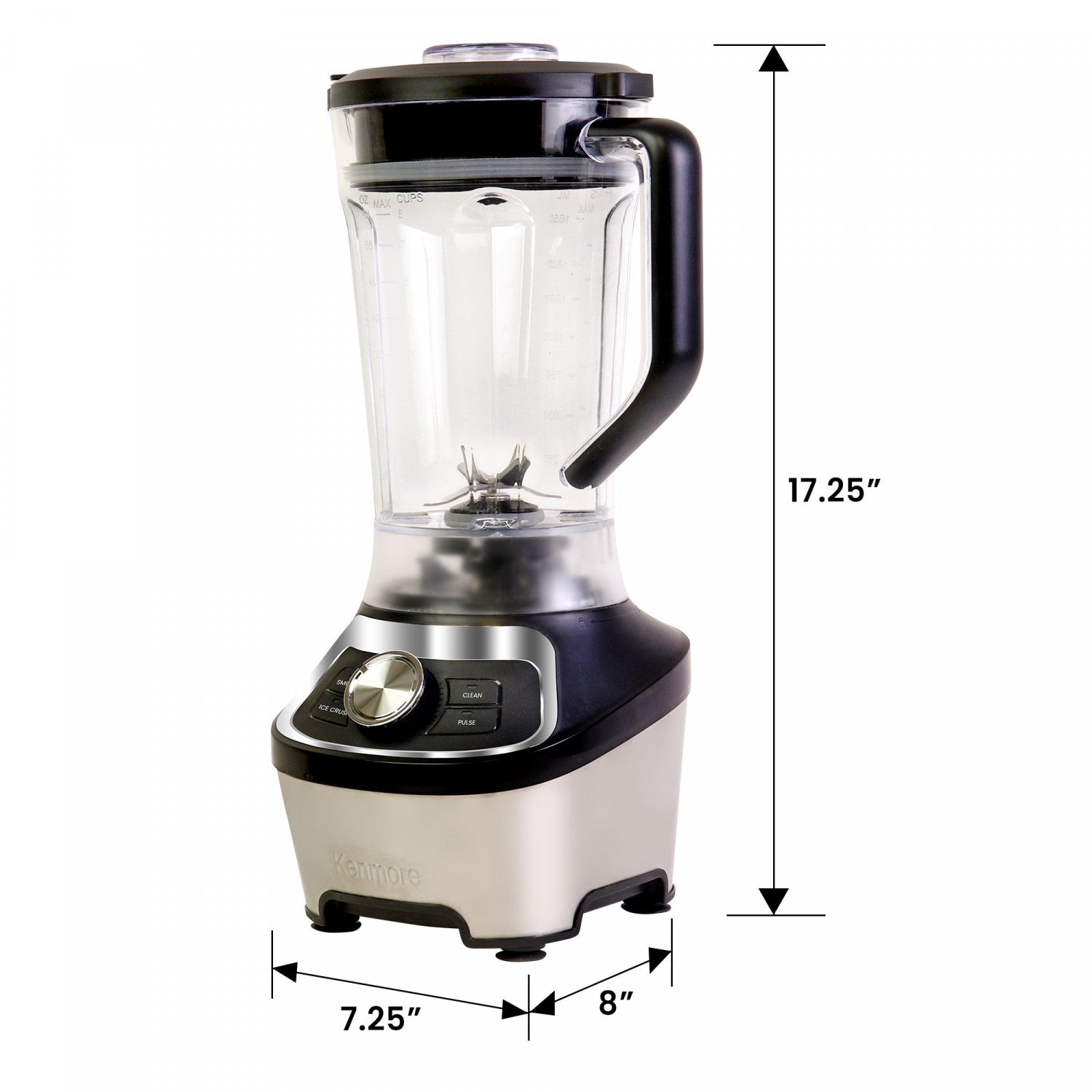 Versatile stand blender with built-in smoothie and ice crush functions: Whip up delicious smoothies, shakes, and salsas in minutes with this powerful stand blender from Kenmore with variable speed control and pre-programmed functions. This countertop blender features a lightweight, shatterproof Tritan pitcher with a generous 8 cup (64 oz) capacity and a flip-up spout cover for mess-free pouring. Use the simple dial control to select the precise speed you want or choose one of the built-in functions. The premium stainless steel quad blade pulverizes ice, fruits and vegetables and the automatic smoothie and ice crush modes cycle through a programmed series of blending operations for consistent results every time. And when you are finished, cleanup is a breeze with the dishwasher-safe blending jar and lid plus auto-clean function.