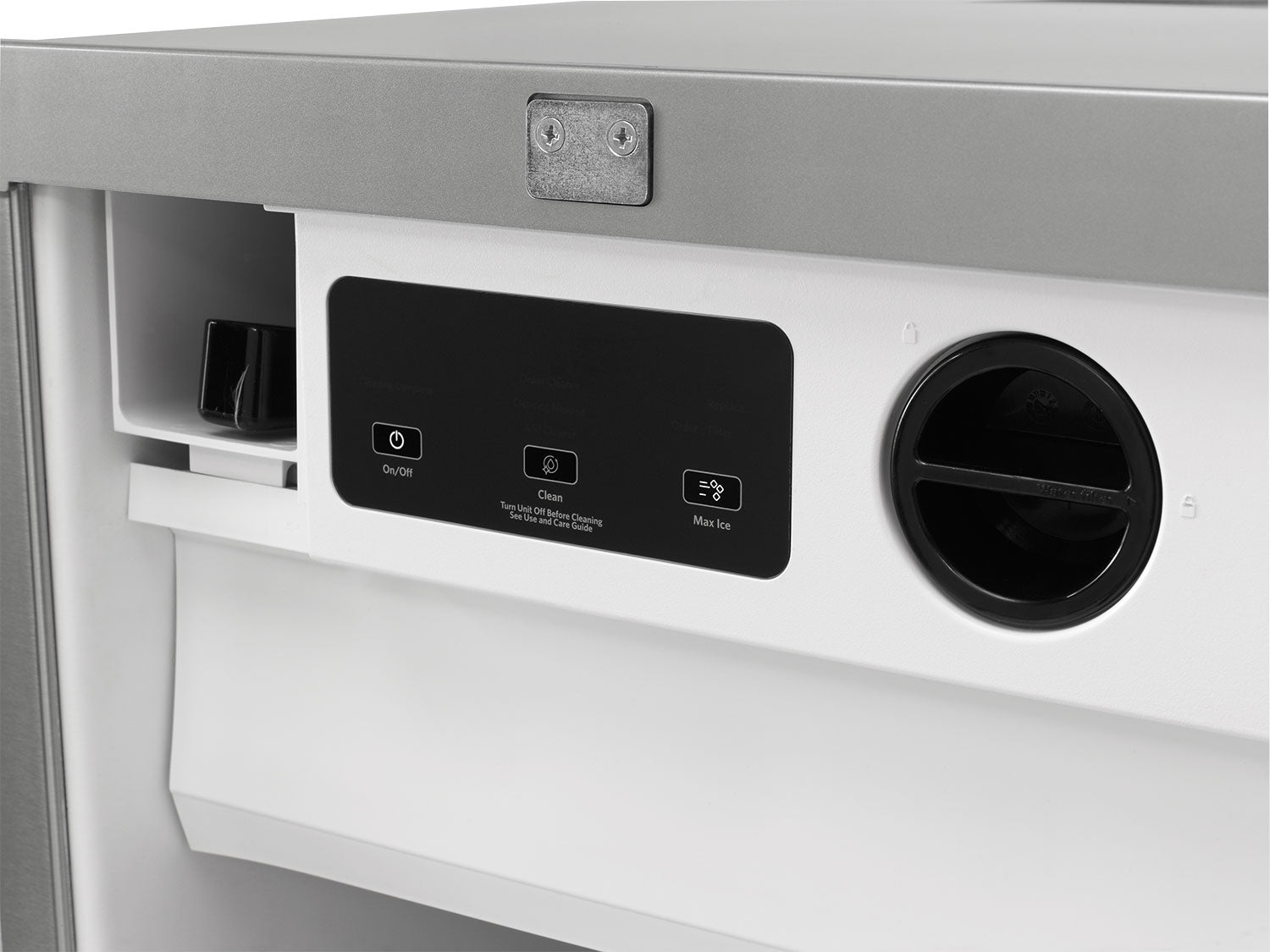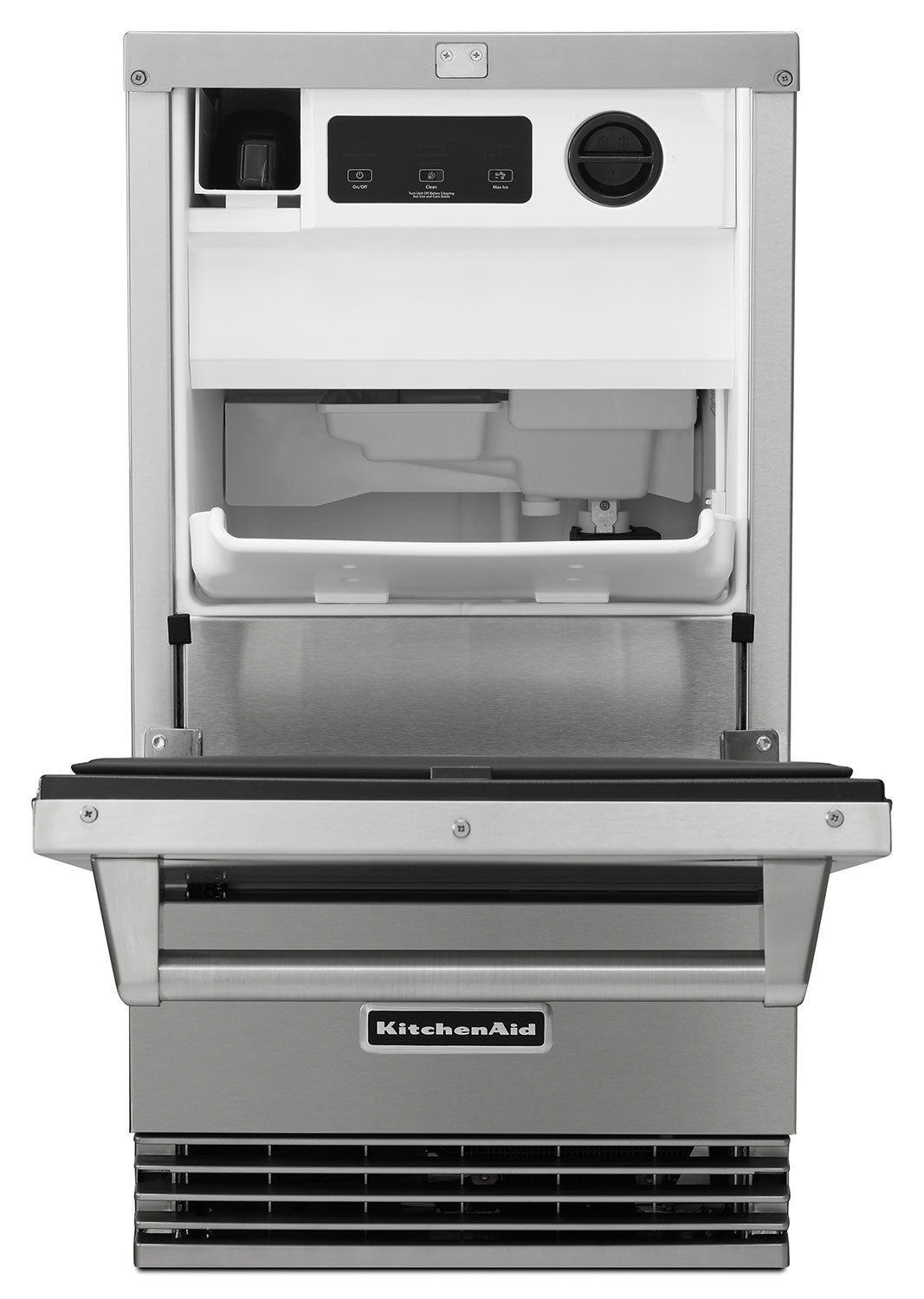 Simplify outdoor entertaining with this KitchenAid outdoor automatic ice maker. With its weather-resistant design, this ice maker can be installed by the pool, on the deck or in any other outdoor area, so you can keep glasses stocked with ice without making frequent trips into the house. Its large storage bin can hold up to 35 pounds of ice, while Clear Ice Technology ensures cubes are uniformly sized.