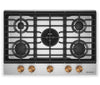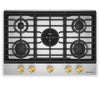 Five Versatile Burners: Edge-to-Edge Cast-Iron Grates: Premium Weighted Knobs: 6,000 BTU Simmer Burner: 17,000 BTU Power Burner: Wall-Oven Compatible Design: Electronic Ignition: Sealed Burner Construction: ADA Compliant: LP Conversion Included: |