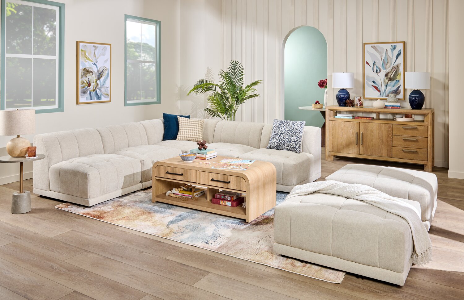 | Sold Separately | Additional Oaklyn modular armless chairs, corner chairs and ottomans. |