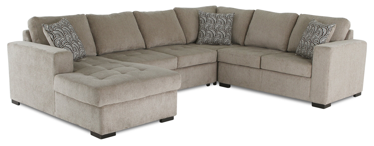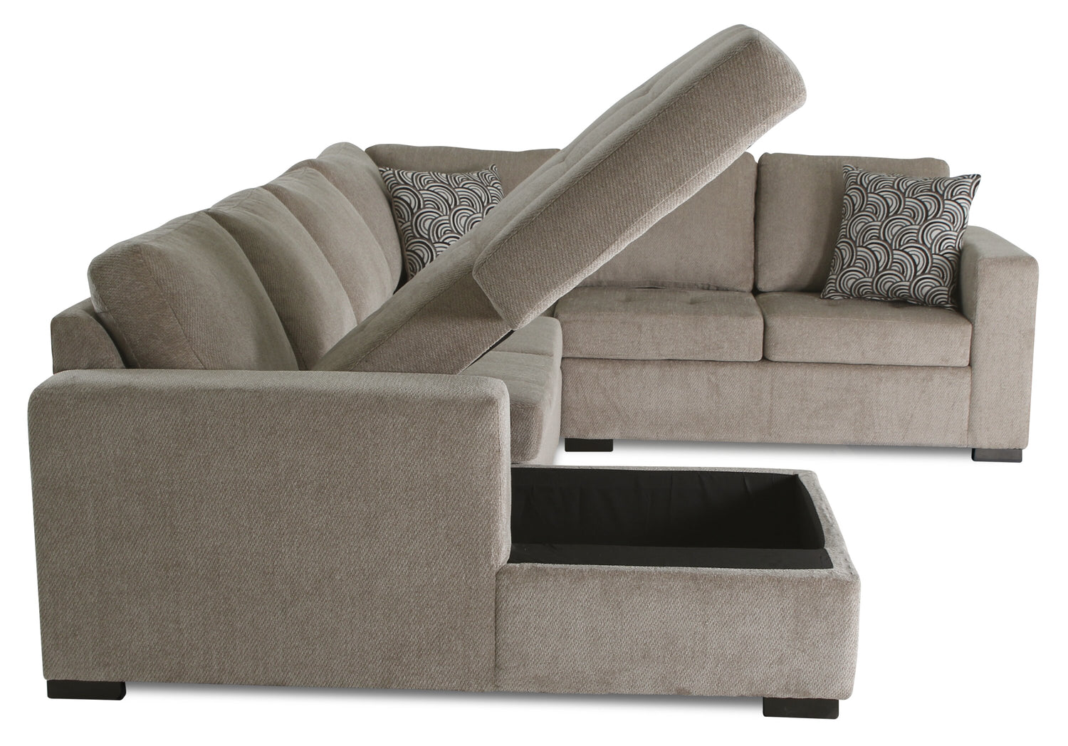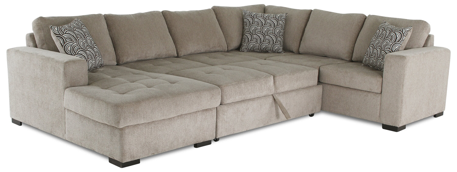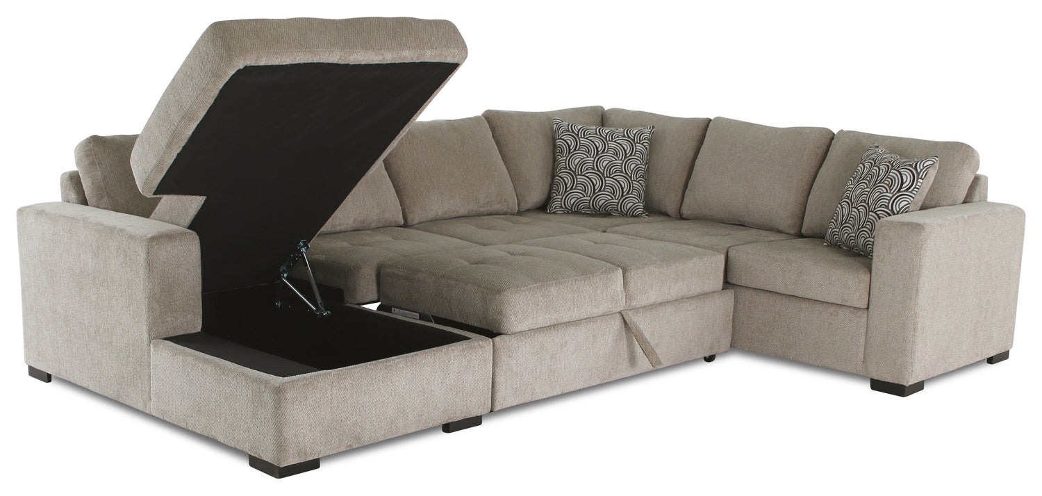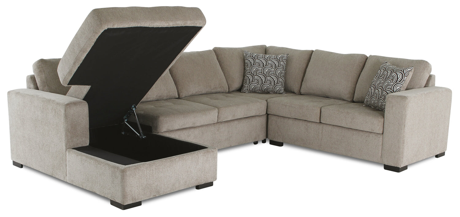 In a busy life, multipurpose furniture can make everyday occurrences so much easier. Whether for hiding clutter, having over night guests or hosting a family movie night, this spacious Legend four-piece sectional can do it all in style. With a calm, contemporary design and a rich platinum colour, this sofa will add a sense of comfort to your home. If a last-minute visitor needs to stay the night or an important guest is about to come by, you'll be prepared. Hide your disarray in the storage chaise, set up the built-in sleeper bed and be ready when you need to.
