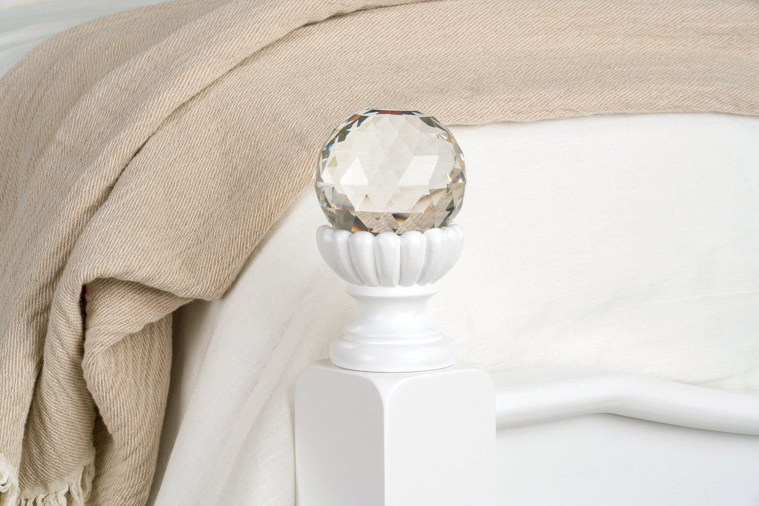 Accent Details | A panel of white faux leather with tufted crystal buttons decorates the headboard. Crystal orbs and carved wooden roses adorn the tops of the headboard and footboard. |