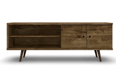 The Liberty 62.99 Mid-Century Modern TV Stand is a high quality, beautifully crafted, functional unit. Featuring two open shelves, and one large concealed compartment perfect for stashing DVDs, board games, electronics, and media accessories, this entertainment center is the ultimate gathering place and will create a statement in any space. Artful grooves mix well with any decor and splayed wooden legs add character and ease for moving. Available in white, white and rustic brown, white and aqua blue, white and yellow, rustic brown, rustic brown and white, and rustic brown and yellow.
