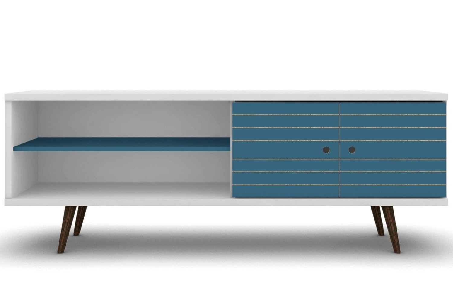 The Liberty 62.99 Mid-Century Modern TV Stand is a high quality, beautifully crafted, functional unit. Featuring two open shelves, and one large concealed compartment perfect for stashing DVDs, board games, electronics, and media accessories, this entertainment center is the ultimate gathering place and will create a statement in any space. Artful grooves mix well with any decor and splayed wooden legs add character and ease for moving. Available in white, white and rustic brown, white and aqua blue, white and yellow, rustic brown, rustic brown and white, and rustic brown and yellow.