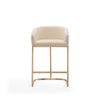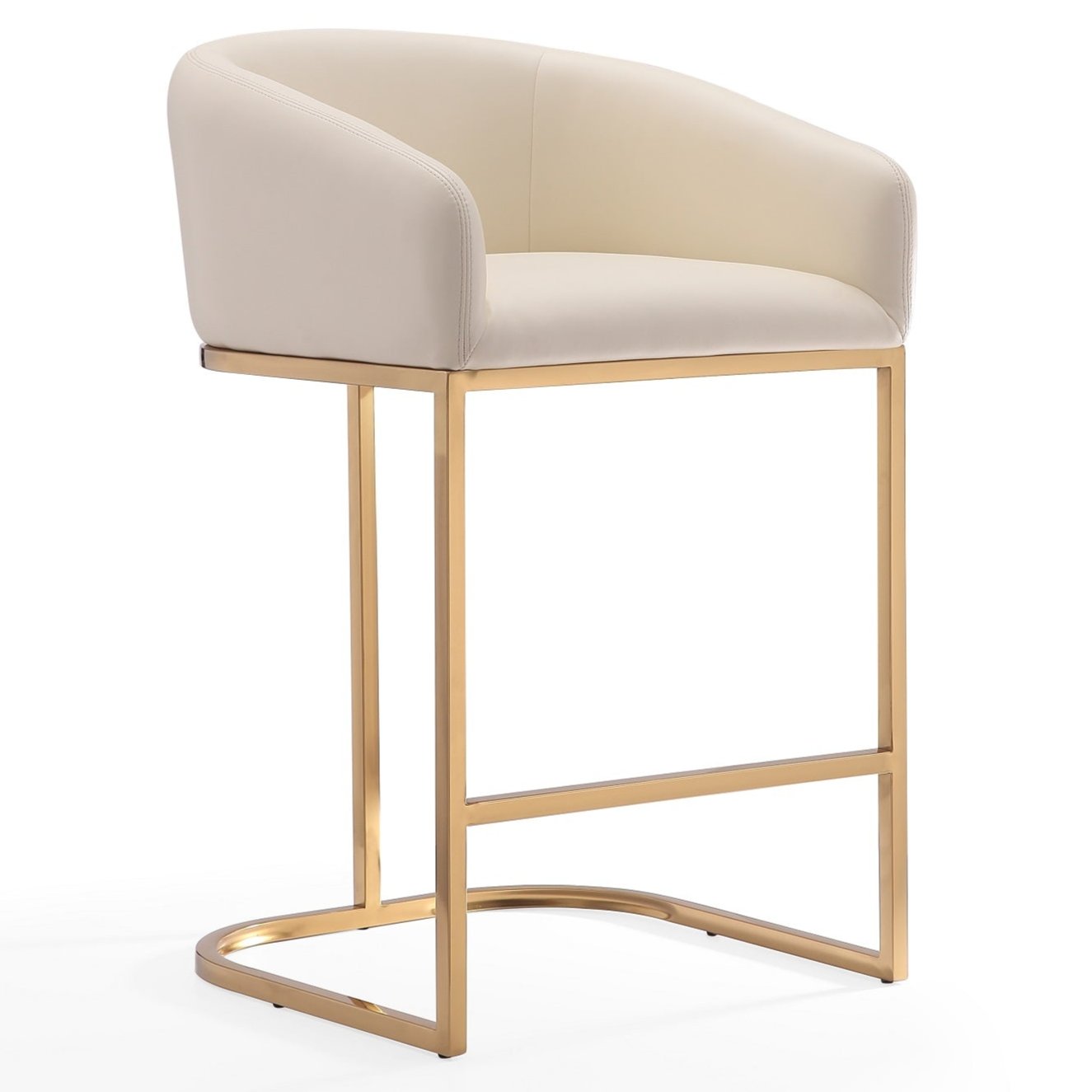 A hint of mid-century modern style that brings the chic and elegant flair to any home's decor. This stool is all kinds of wonderful. A clean-lined, curved, and comfortable seat, sits atop a shimmery gold semi-circle pedestal base. A metal footrest finishes the look, bringing added comfort to the leather-upholstered piece. Gorgeously well-served, in a perfect neutral tone for that touch of warm texture.