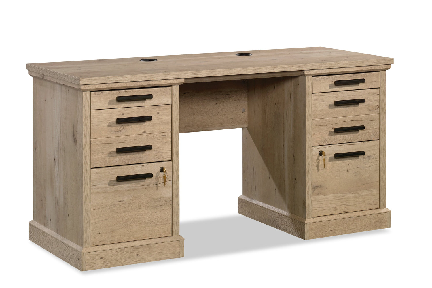 Whether you need a small workspace or an office credenza to expand storage, turn to this Mason Peak desk. Featuring a melamine-finished surface that is heat-, stain- and scratch-resistant, this piece is ready to tackle big projects, with durability for display. Four drawers can house your pens, paper and other office must-haves. Plus, your documents will be easily organized in the two lower drawers that hold letter-, legal- or European-size hanging files. Finished in a light, natural tone, this workstation brings together the perks of a desk and filing cabinet all in one.