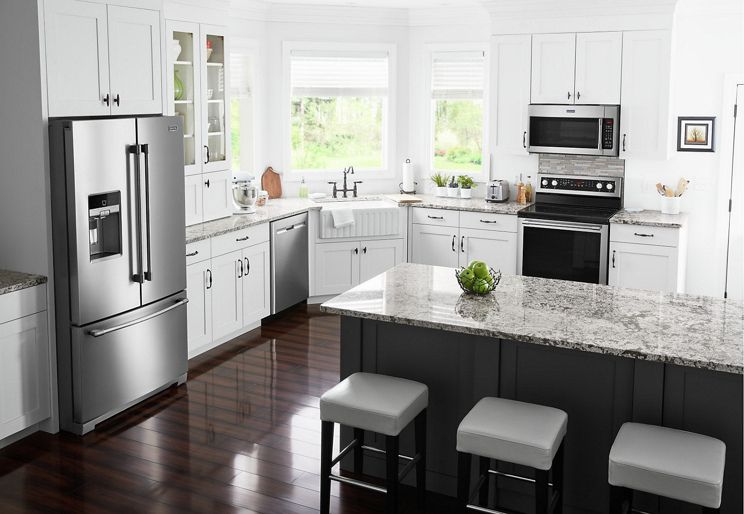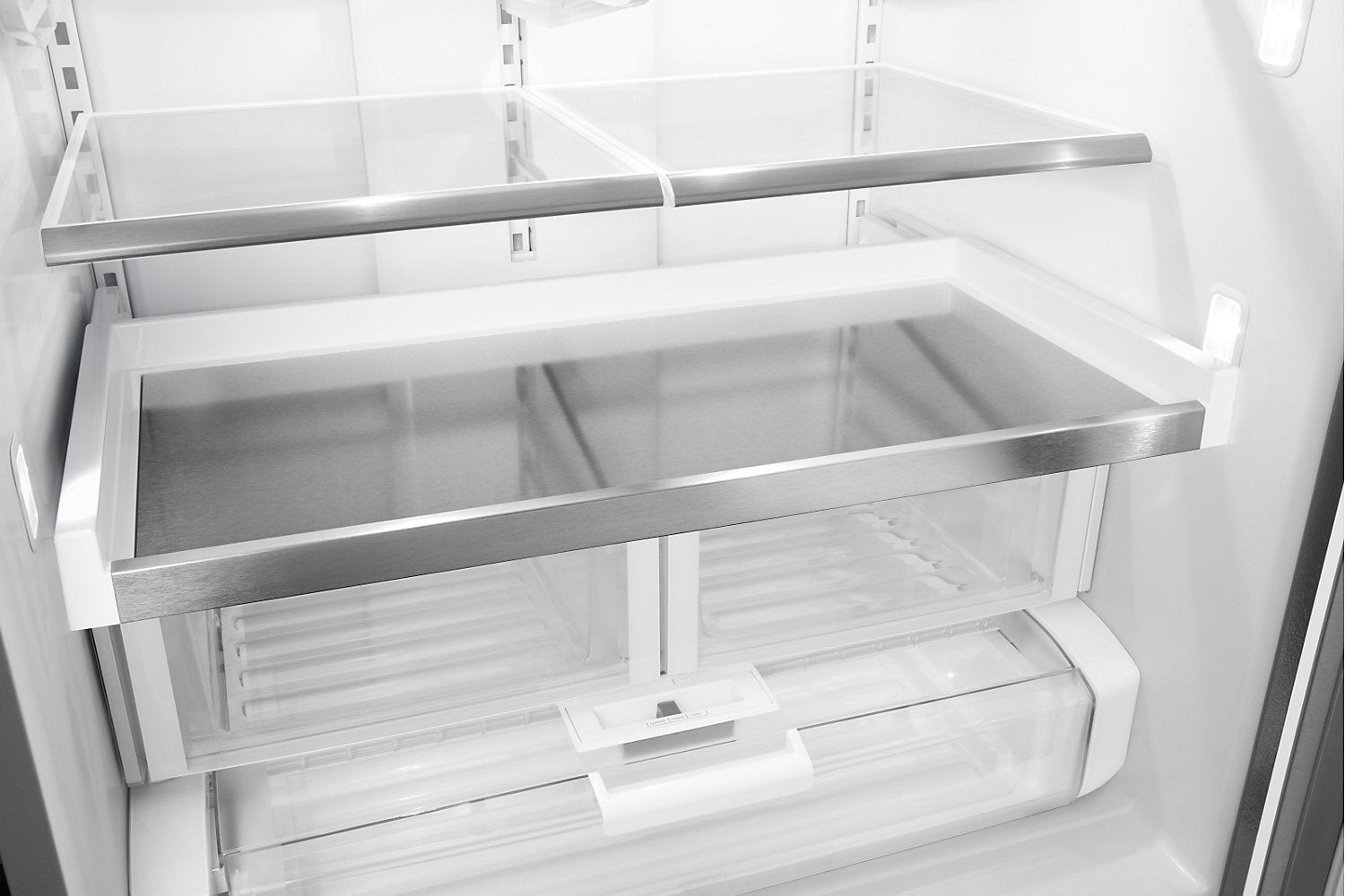 Maytag’s stainless steel French-door refrigerators are built tough, with strength and storage you can depend on. The PowerCold® feature gives you temperature control with the push of a button and the FreshLock™ crispers use humidity control to keep your produce full of flavor. The metal slide-out shelf gives you fast access to foods and LED lighting helps you see what you're working with. Free up shelf space in this 36-inch refrigerator with the removable Store-N-Door® ice dispensing system, which is perfect for filling large containers like blenders and coolers.