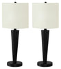 Create a polished contemporary ambiance in your home with this set of 2, 24"h table lamps. The sleek tapered black metal frame over a round metal base, topped with an ivory linen fabric shade and finished with a round black metal finial, makes these versatile lamps perfect to illuminate your office, living room, or bedroom. Each accent lamp is equipped with a rotary switch on the base for easy on and off access, and a USB port included for charging your favourite devices. Using a single bulb (not included) for a maximum output of 60W/120V and attached with a 6ft black cord, this set of lamps provides a practical lighting solution when placed on your end or side table, console table, nightstand or bedside table. Made with quality materials, this set includes a 2-year limited warranty against any manufacturer's defects for a worry-free purchase.