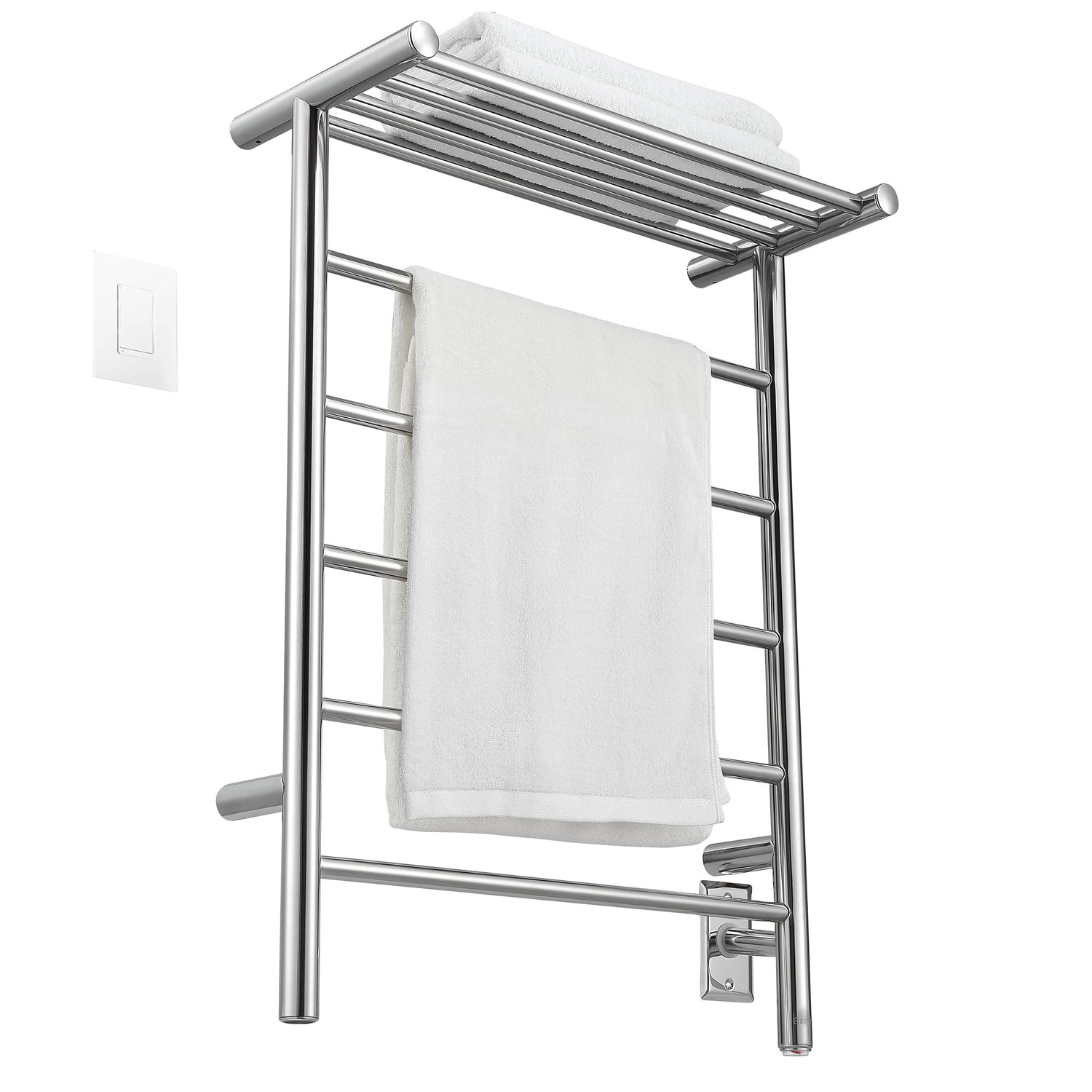 Featuring our easy-to use programmable WiFi digital wall timer, this Miazzo towel warmer and drying rack can be controlled directly from your smartphone to give you a fresh warm towel at just the right time for convenient energy savings and peace of mind while at home or away. Expertly crafted in high quality polished stainless steel, the Miazzo, is designed with a unique space saving integrated heated shelf perfect for extra towels and two convenient installation options - install it on your wall using the discreet hardwire option or simply plug into an existing outlet – the choice is yours! Beautiful in bathrooms and full of possibilities in the laundry room, exercise room, mudroom or bedroom, the Ancona Miazzo is an elegant and eco-friendly way to keep your towels and clothes dry, fresh and warm in any weather.