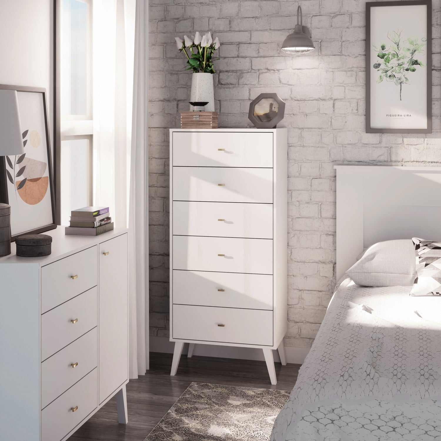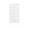 If you are looking to add a touch of vintage to your bedroom, the Prepac Milo Tall 6-drawer Chest offers a modern take on the retro look. Its narrow, space saving design provides maximum storage in the smallest footprint, making it a great fit for condos and smaller spaces. Six drawers run smoothly on metal glides, offering easy access to storage for clothing and bedroom items. The tapered solid wood legs and inset drawers deliver a clean and modern look to your bedroom. Brushed brass finished knobs add to the retro-chic design for a functional and fashionable dresser. Style this dresser on its own, or combine it with any of the products in the Milo collection for a timeless look.
