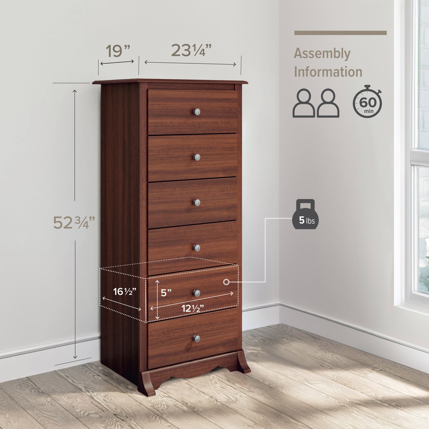 Who needs a traditionally sized chest when you can have the Monterey Tall 6 Drawer Chest? With six drawers' worth of storage, you'll have room for your clothing, and you'll save floor space, too. This slender little number has lots to offer in the looks department, too: with subtle details like a scalloped base panel, this is one chest that truly has it all. Liven up your bedroom's decor by coordinating it with other members of the Monterey Bedroom Collection!