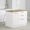 More than an additional work surface: a kitchen essential. Thanks to this kitchen island with integrated storage, your kitchen will never have been so well organized! Take advantage of the 3 reinforced drawers and the door behind which is an adjustable shelf for storing dishes, utensils, cookware and small appliances. Door and drawer slow close mechanism ensure smooth, quiet operation. The water and scratch resistant surface increases your work surface tenfold, allowing you to cook your favorite dishes with complete peace of mind. The polypropylene drawer interiors are even fully washable! All in all, you'll love this low maintenance kitchen island. Versatile contemporary style add a little love to your kitchen with this kitchen island featuring stool space and plenty of storage. It's the ideal piece of furniture for extra seating when you're hosting guests, or for creating a breakfast nook in a small space. Its nice metal handles give it a contemporary look that complements most decors. The result is a timeless piece of furniture that's perfect for both apartments and larger houses.