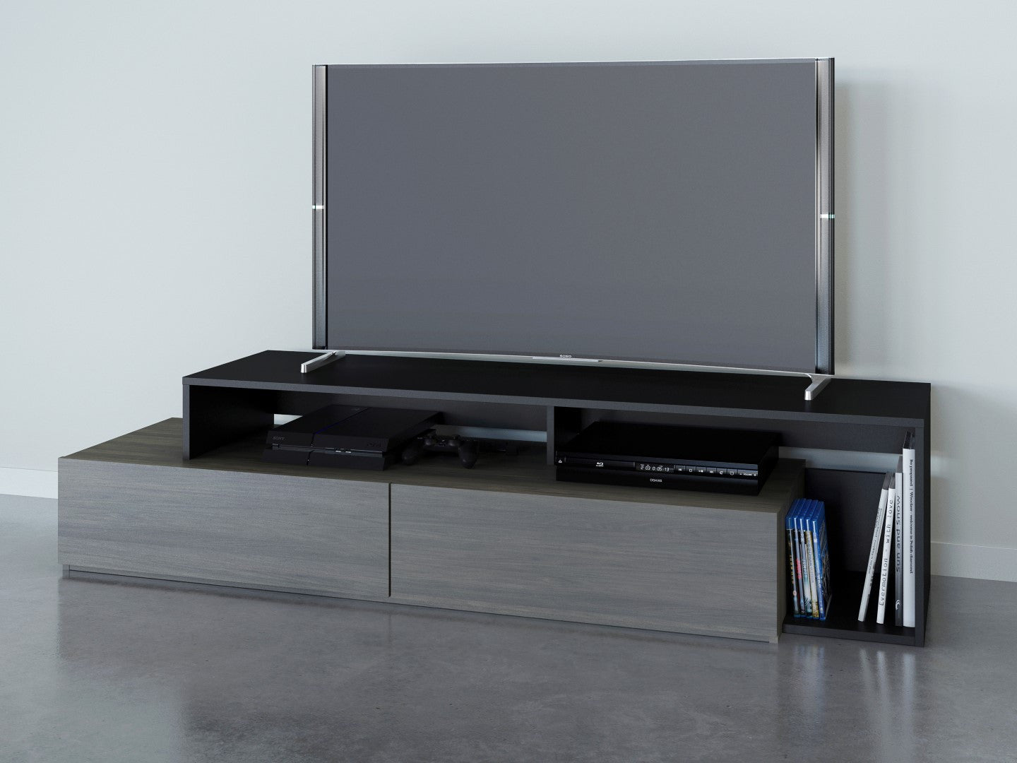 This Damask 72-inch TV stand was created with a modern touch in mind with its clean lines and contrasting volumes. This TV stand features 2 convenient storage drawers and open space compartments for decorative pieces, all in a rich black and Bark Grey finish. The Damask entertainment collection from Nexera is distinguished by its clean modern lines, high-end designer look and contrasting volumes.
