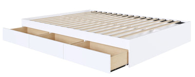 Nexera Full size 3-drawer bed in White can be paired with different Nexera Full size headboards to create a complete bed set with lots of storage. This Full Size 3-Drawer Storage bed offers 3 convenient drawers, ideal to store away beddings, clothes, toys, books without taking any extra square footage. It's also entirely reversible, so you can decide on which side of the bed you prefer having the 3 drawers. This bed frame features a unique metal and hardwood slat construction allowing for easy assembly, sturdy construction and easier handling.