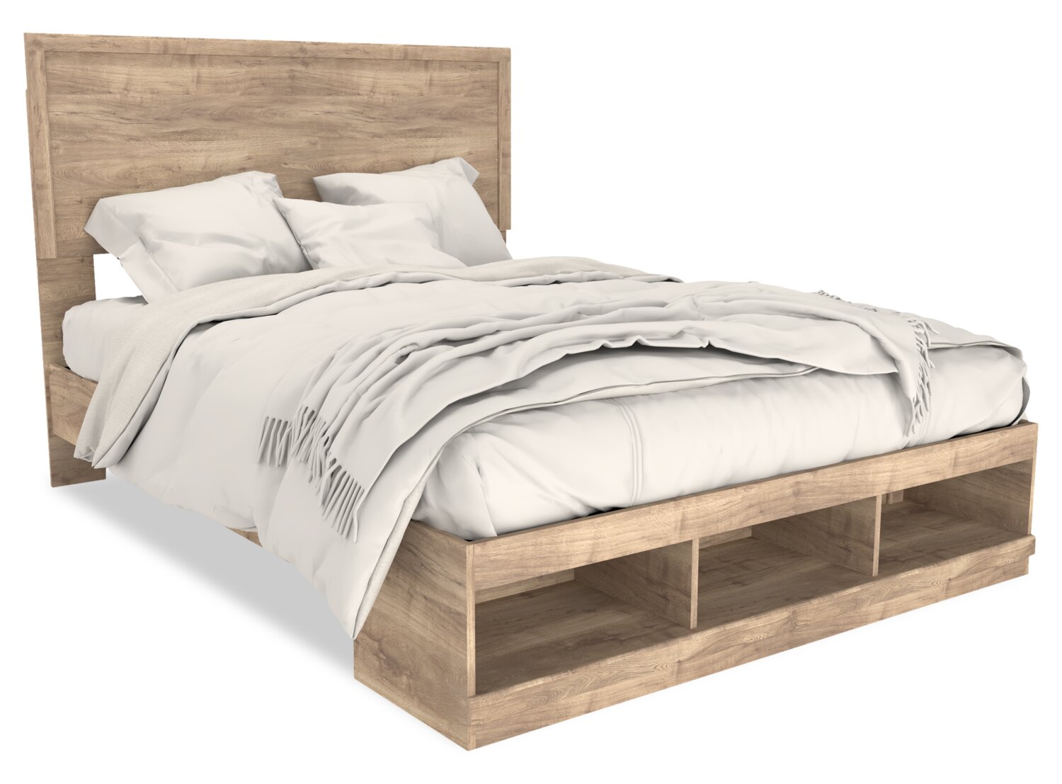 Storage Options | Three shelves at the foot of the bed. |