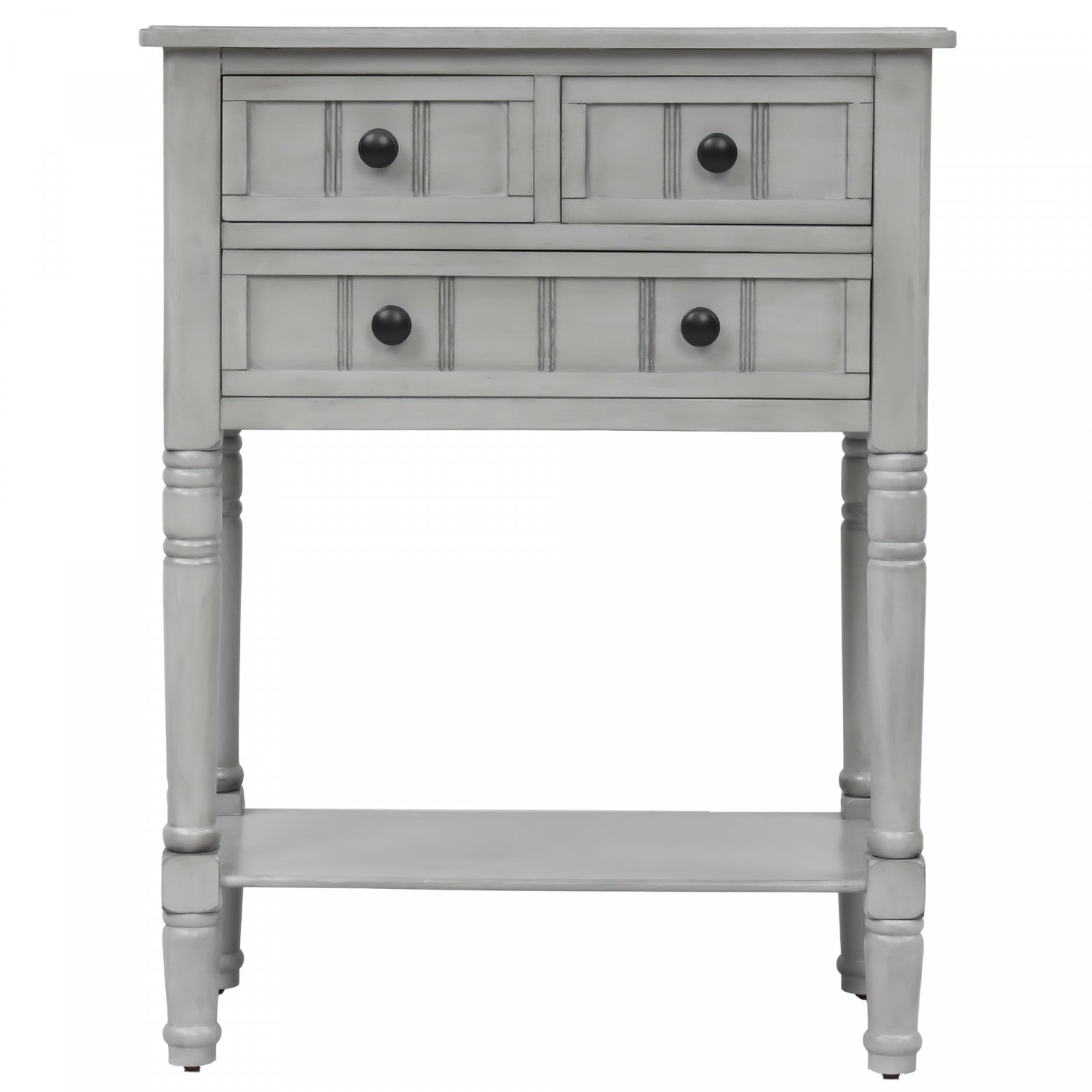 The console table is a stylish, space-saving accent designed for tight hallways or compact living areas. Crafted from solid wood and mdf, it features three drawers in two sizes for organizing everyday items. The open bottom shelf provides additional space for baskets or decor. With elegant tapered legs, round knobs, and a distressed finish, this piece adds charm and function to any interior. Assembly is quick and simple—just attach the legs and shelf. A timeless and practical addition to your home.