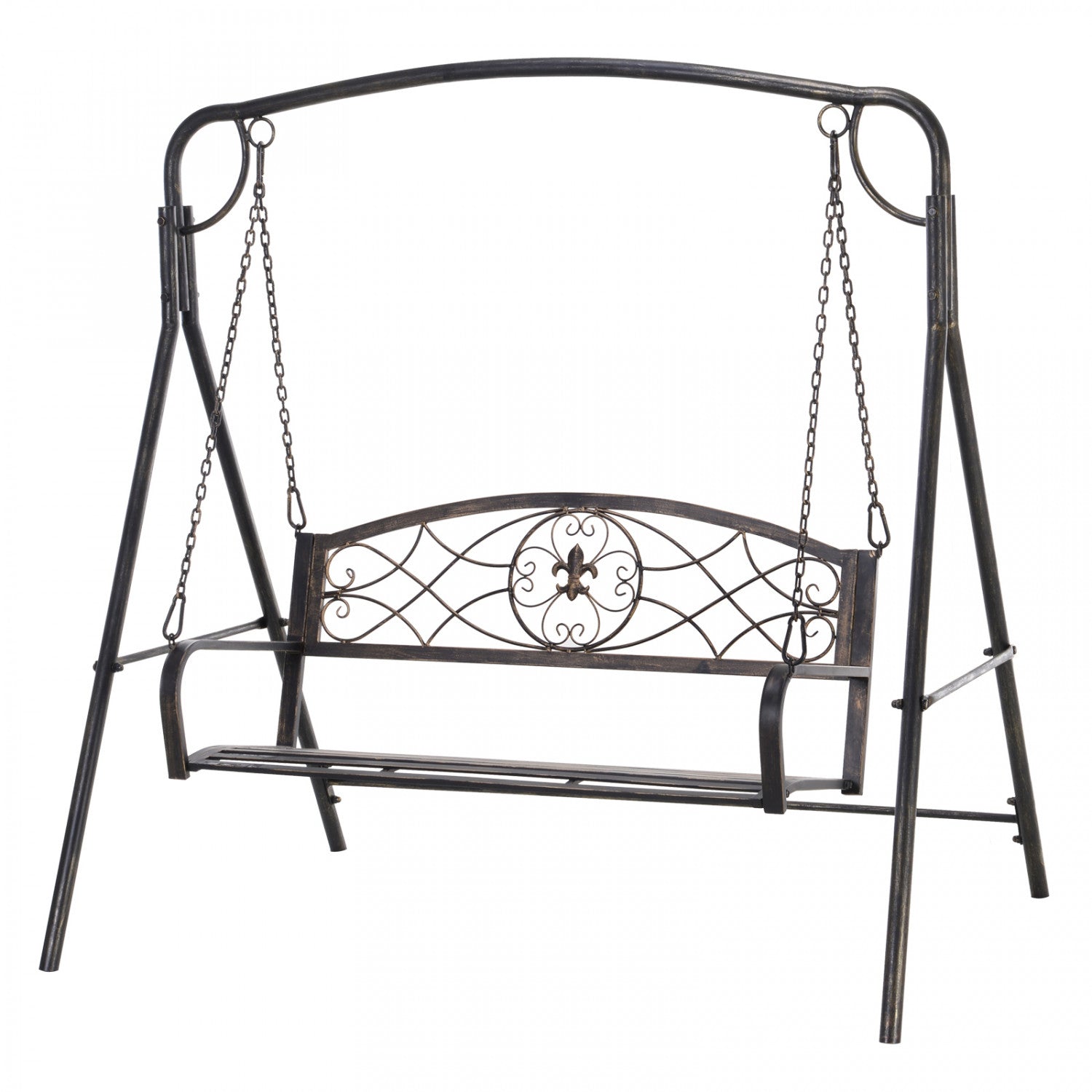 | Key Features | - Double swing chair provides ample room for you and a friend; - Tough and robust solid steel frame with powder coating for outdoor protection and extra strength; - 'A' shaped frame ensures even balance and stability; - Slatted seat prevents water buildup and allows air circulation to keep you cool; - Elegant design featuring floral heart scrolling on the back with an antique gold tone finish; - Slightly curved seat, high back, and armrests for added comfort; - Maximum load capacity of 485 lbs, assembly required; |