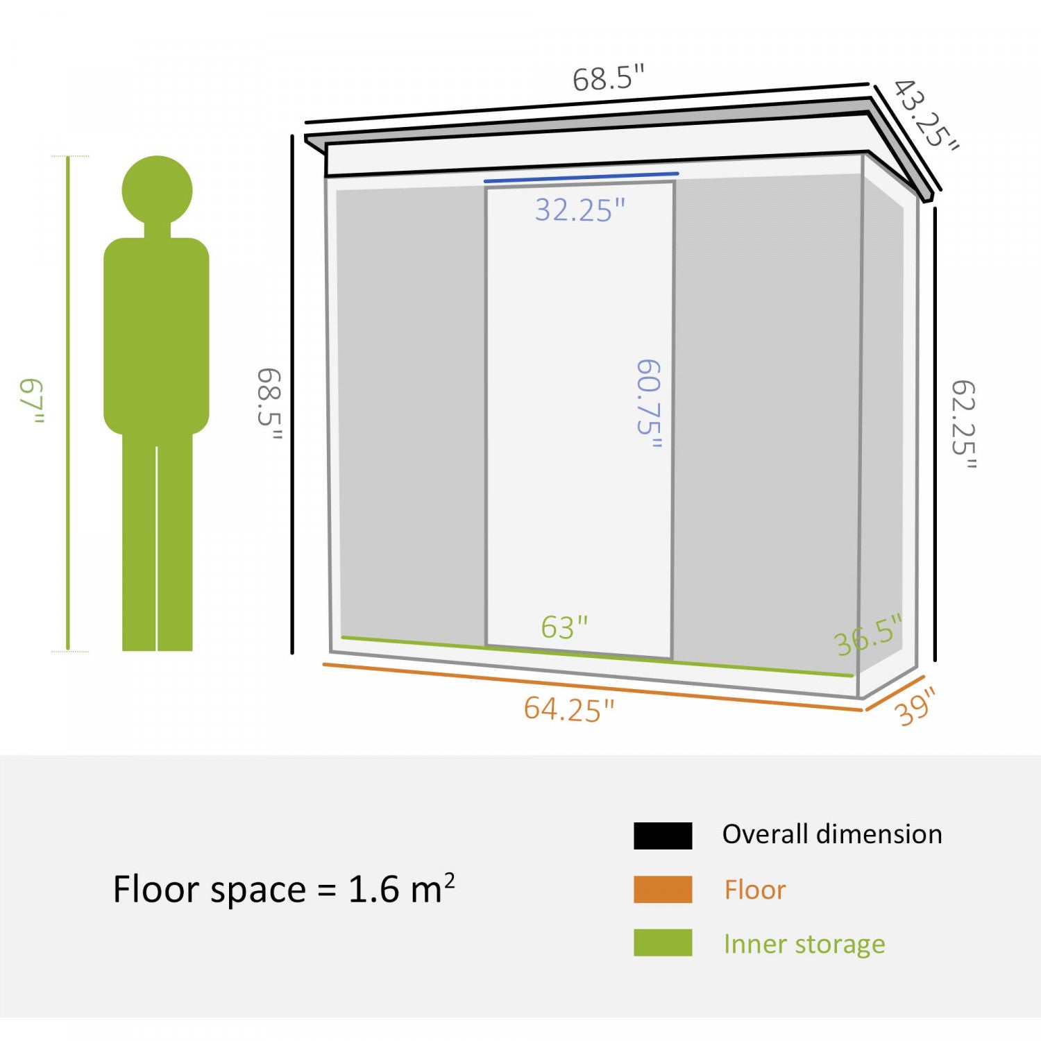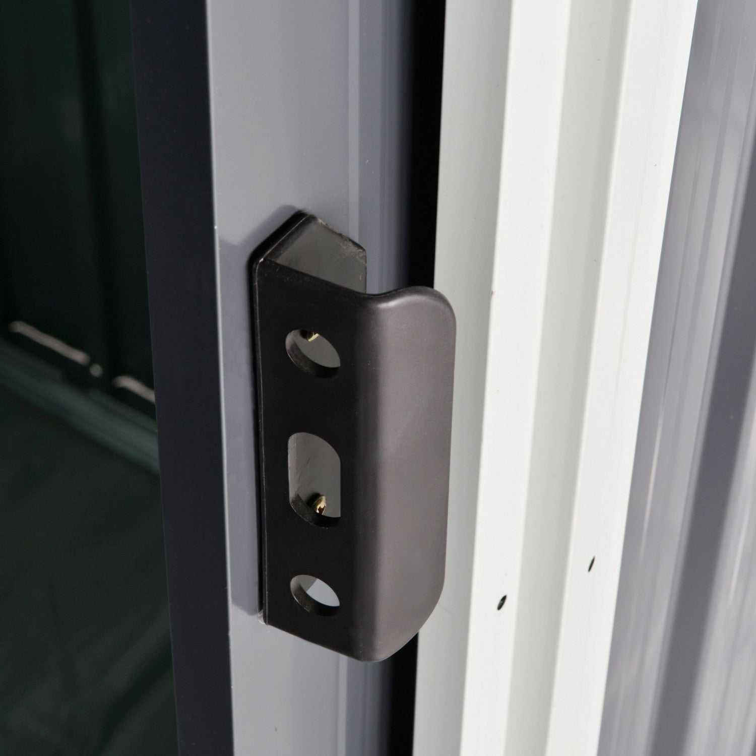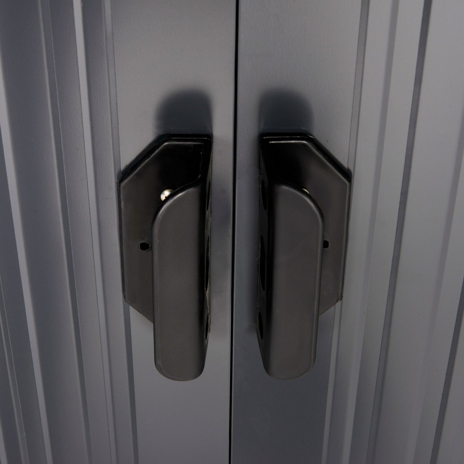 Key Features | ● Ample storage space ● Steel panel walls and roof, resistant to rust and rain ● Sloped roof prevents water build-up ● Double sliding door for easy access in and out ● Lockable Door for security ● Two ventilation slots to keep the interior cool and airy ● Durable galvanized steel structure ● Assembly required |