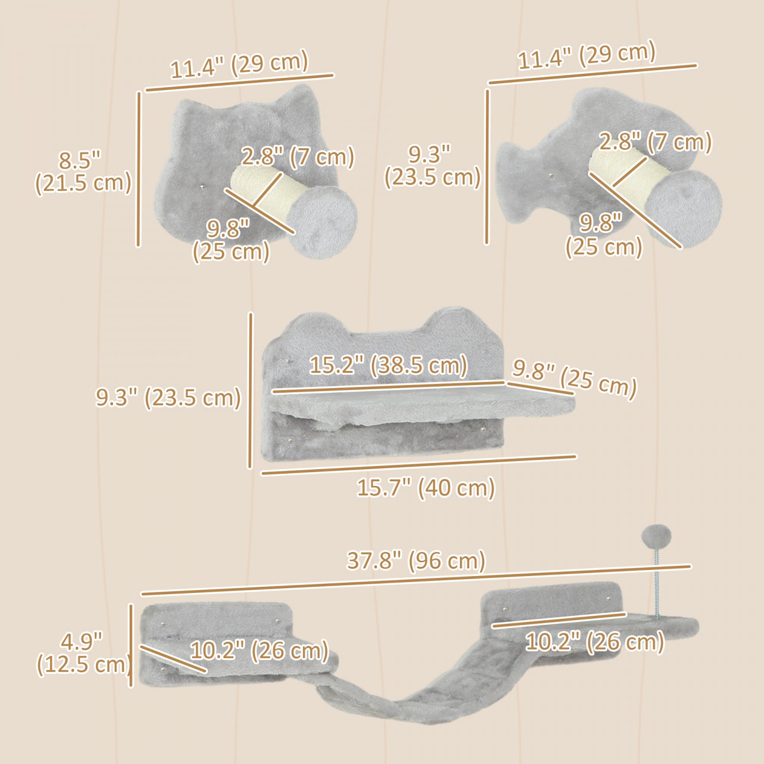 Key Features | ● 4-piece set offers variety in design for playful cats ● Wall-mounted design, satisfy their desire to higher place ● Made of particleboard for long-lasting strength ● Scratching posts save your furniture ● Free from the disturbance of other pets ● Goes well easily with your home's existing decors ● Assembly required |
