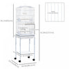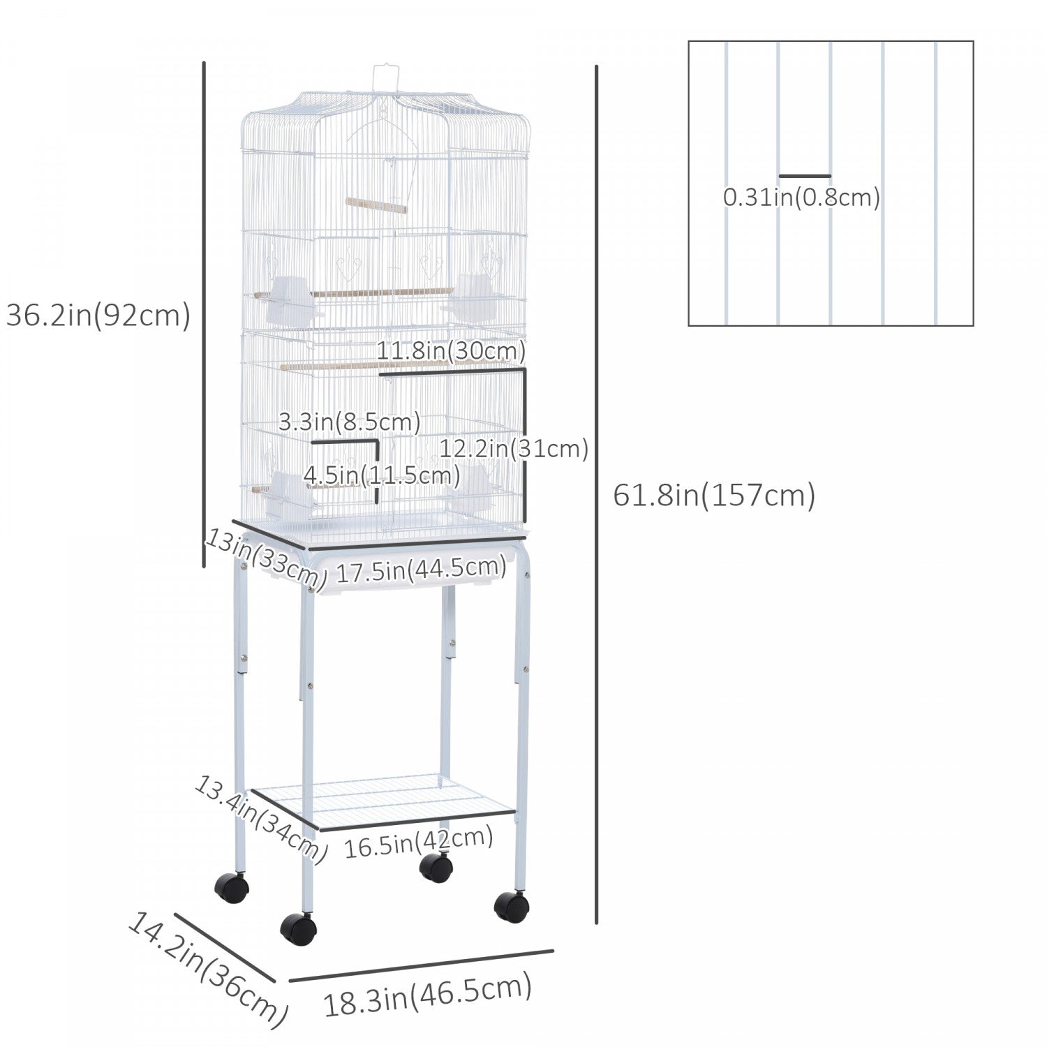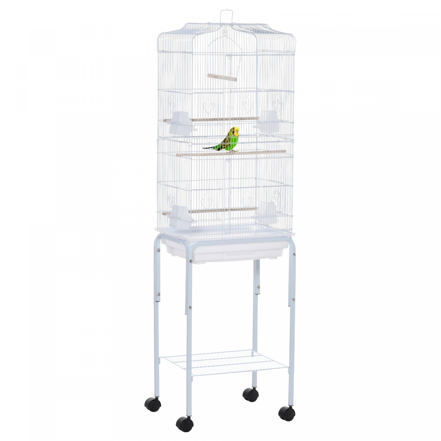 Keep your pet stimulated and safe with an indoor bird cage starter kit with rolling stand from pawhut. This bird cage with wheels includes 3 wood perches, 1 swing, and 4 plastic food containers for your birds to enjoy. Store any accessories in the convenient storage basket on the stand. Keep them safe and secure, but also keep them happy, active, and occupied for a long period of time. The front slide-out tray on the bottom is designed to catch bird seed and slides out to make clean up a breeze.