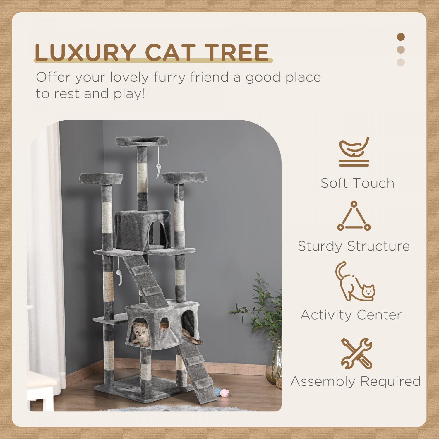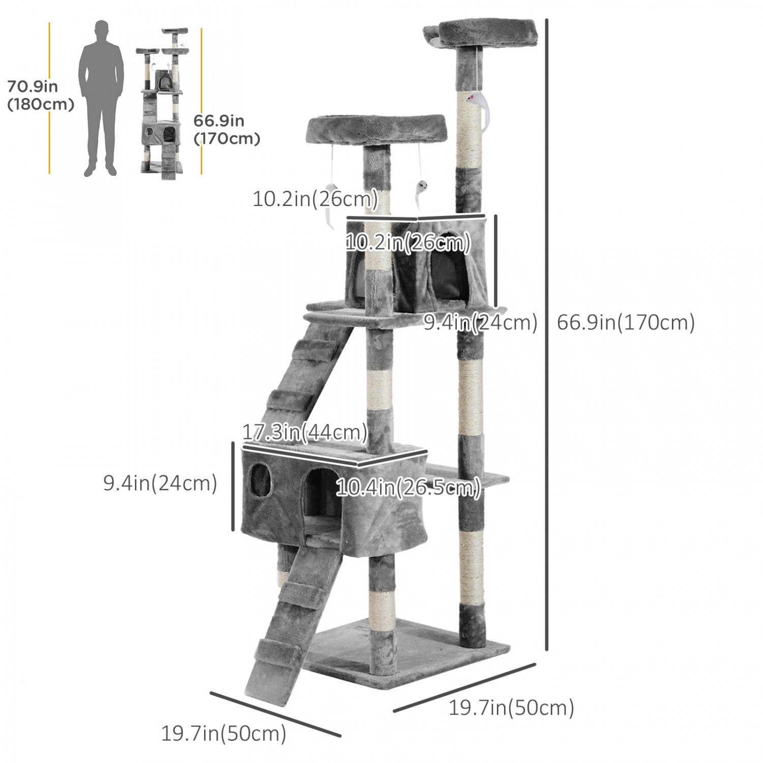 | Key Features | ● Multi-level tall cat tree with 3 x top perches, 2 x spacious condos, 2 x ladders, 3 x dangling toys for cat to play; ● Solid particle base construction wrapped with warm and soft plush; ● Post made with the wear-resistant sisal rope for your cat's scratching and grooming needs; ● Sharpens your cat's claws and allows them to climb while saving your furniture from damages; ● Includes 3 mouse-shaped dangling pom-pom toys; ● Some assembly required; |