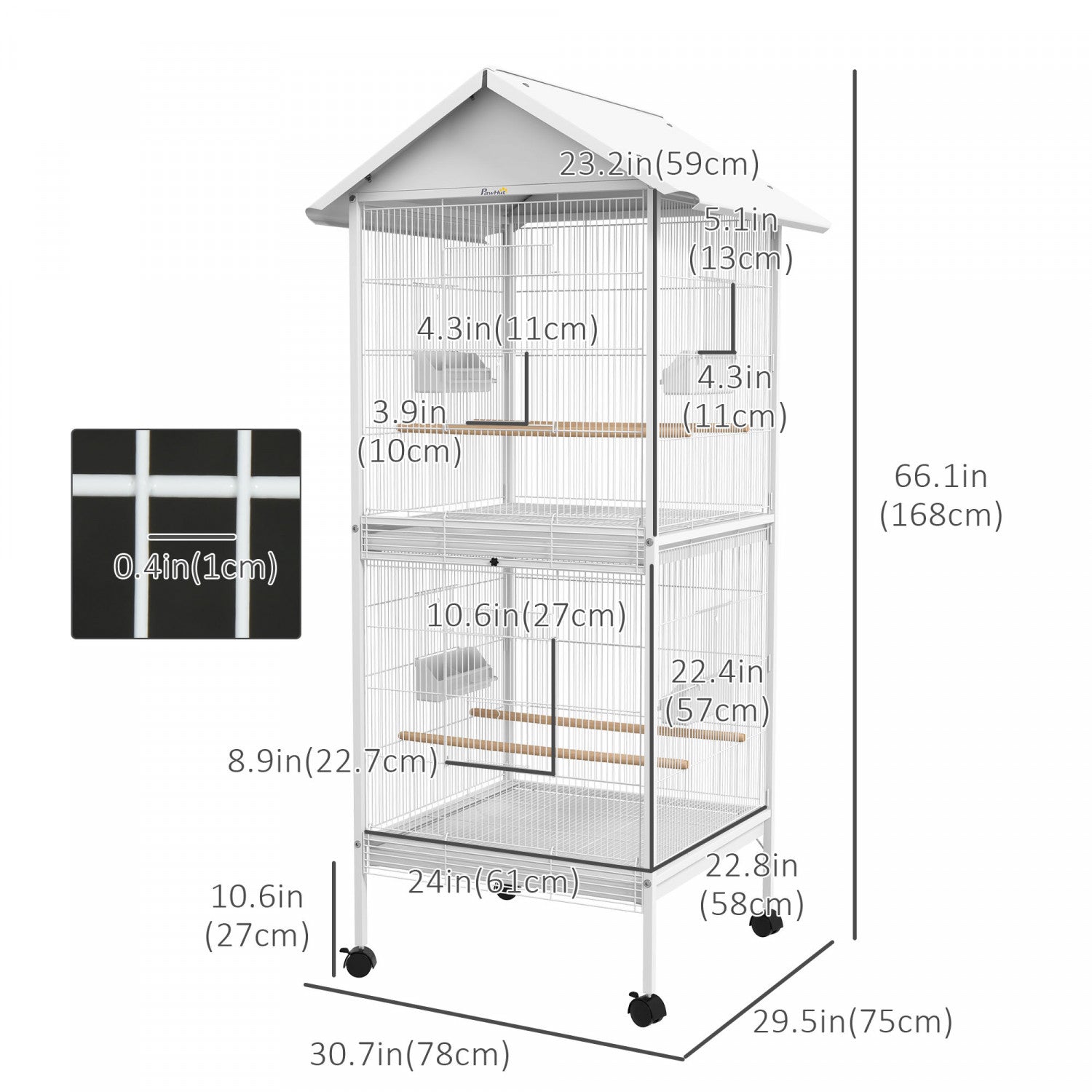 Pawhut Wrought Metal Bird Cage Feeder With Rolling Stand Perches Food Containers Doors Wheels 67" H, White