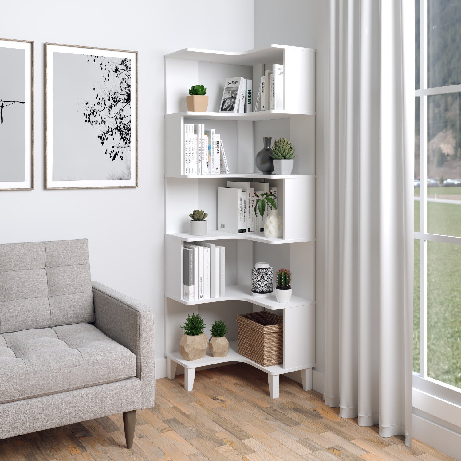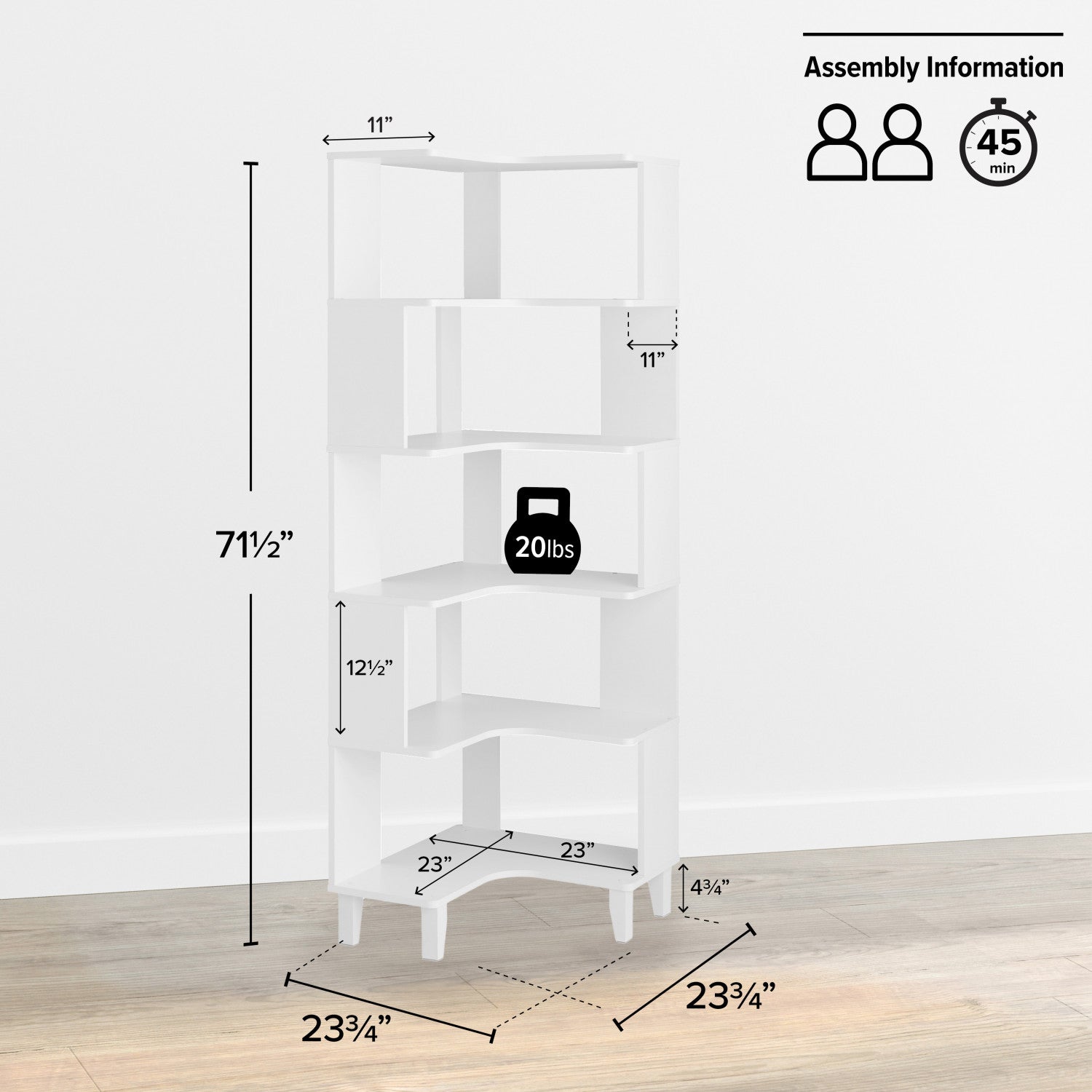 The Prepac White Nordik Corner Bookcase combines style and functionality with its extra height and sturdy build, maximizing storage in any corner. Measuring 23.25" D x 23.25" W x 71.5" H, it suits various décor styles and enhances room organization.