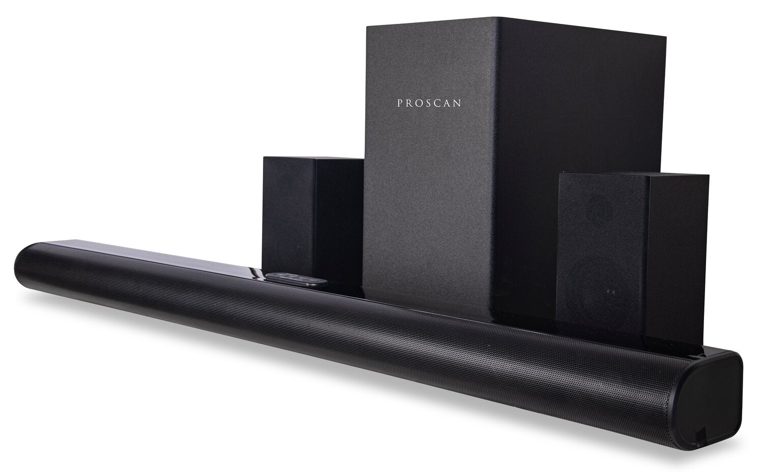 Upgrade your sound system with this surround sound soundbar and subwoofer set from Proscan. Featuring 140 watts of power, a subwoofer and 5.1-channel audio, your favourite movies, TV shows and video games will immerse you in the action for an enhanced experience. The compact subwoofer size allows you to place it in an ideal spot in your home, while Bluetooth capabilities let you pump up the party and stream tunes with ease. Plus, an LED display and included remote control make it easy to adjust the volume, settings and more for the best audio.