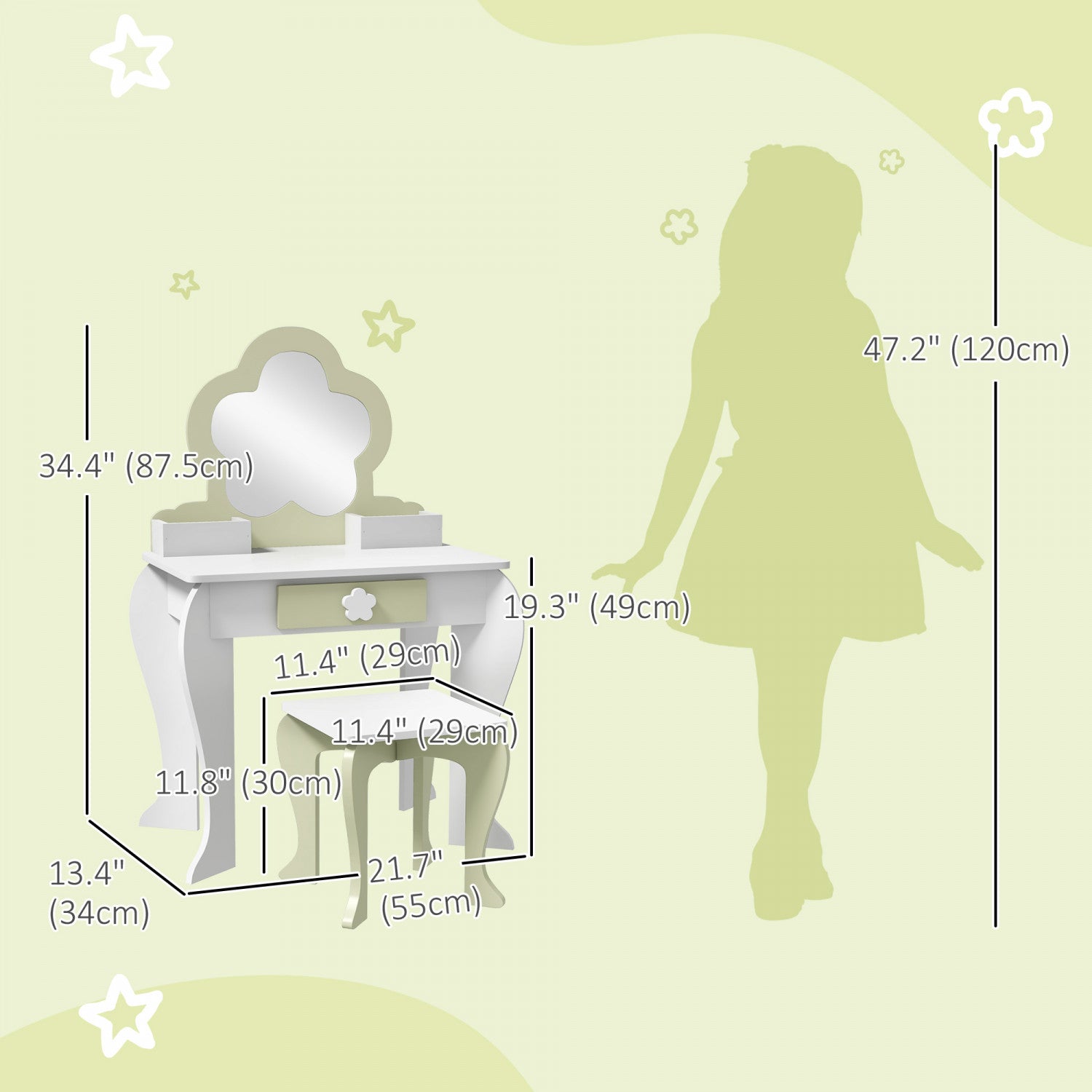 | Key Features | ● A kids dressing table set, which includes a vanity table, matching stool and a mirror ● A cute flower design that'll uplift any room ● Suitable for bedrooms, playrooms and nurseries ● Easy to clean ● Clear and visible mirrors are made of acrylic ● Includes a drawer for keeping loose items organised ● Assembly required |