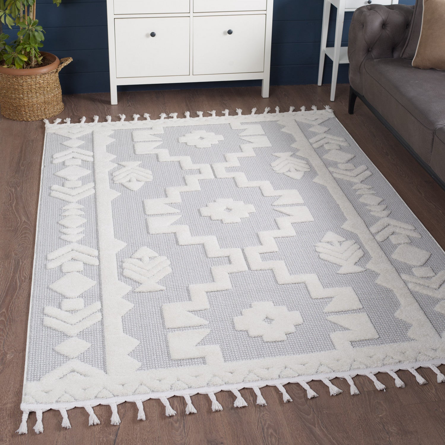 This beautiful shag area rug features an exquisite Triple Medallion design and a neutral light cream pile.