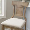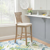 This bar stool is textured with a brown finish that is completed with a hand applied washed finish to give it a rustic and vintage appeal. The eye-catching back draws attention with its swooping sides, straight lined top rail, and hand woven rattan center detail. The easy to maintain seat is upholstered in 100% polyester fabric that mimics the look of a beige linen. Solid wood construction and footrails provide comfort and stability. The 30" seat height is perfect for any counter with heights of 41" to 43".