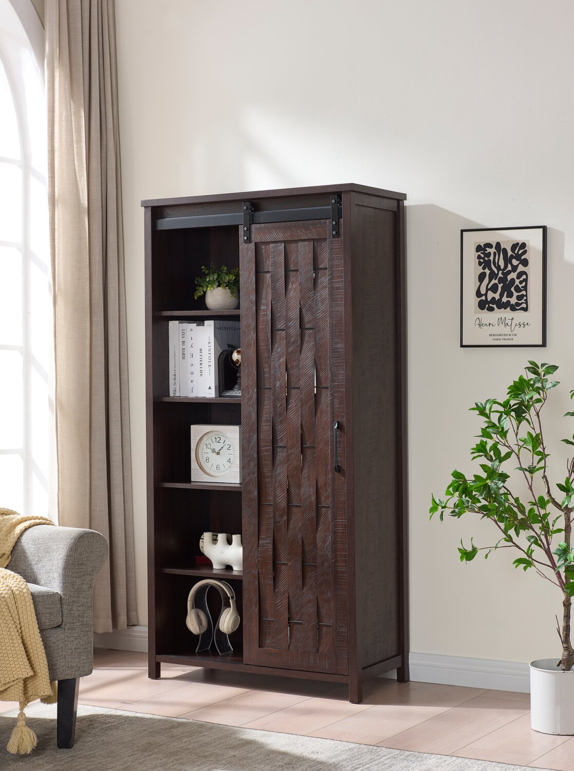 Bring warmth and character to your home with this Sienna storage cabinet, where farmhouse charm meets everyday function. A barn-style door glides smoothly along its metal track, offering classic country appeal while revealing versatile storage within. Woven, natural wood-look doors add rich texture and visual interest, giving this piece a stylish edge. Inside, four shelves provide generous space for both display and organization. Perfect for a hallway, bedroom or living room, the Sienna blends rustic beauty with practical design.