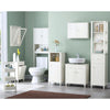 Surpassing the expectations of a laundry cabinet, this smart design slides open with a pull of the white knob and provides ample space for your laundry items. Comes with a spacy counter top for even more space. Measuring 16 x 12 x 23 ", this laundry cabinet fits nicely into your bathroom. A smooth white coating with solid wood carved legs and a durable MDF wood design will complement your space for a long time.