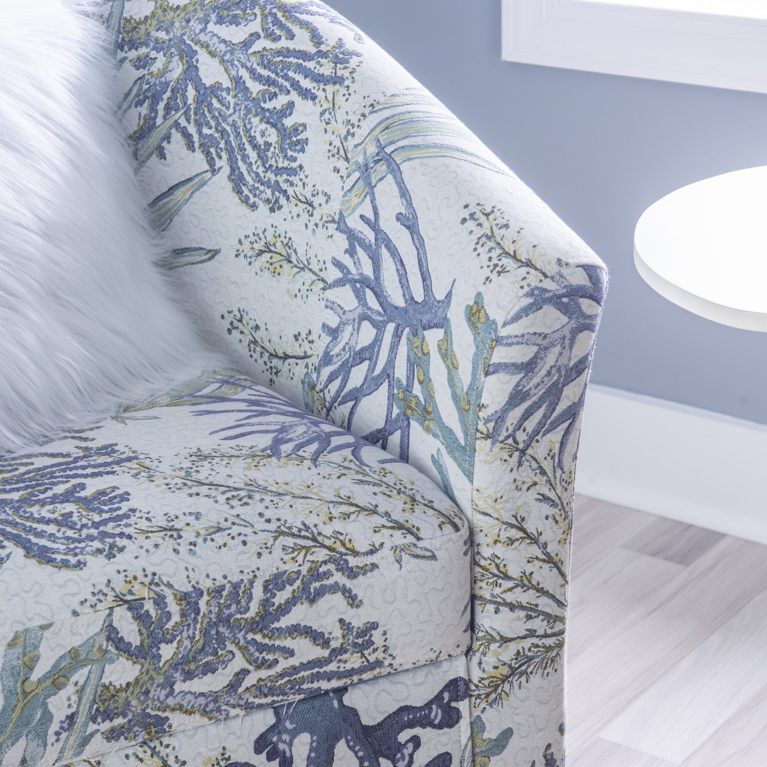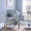 Make every day feel like a beach day with this multicoloured coral print club chair. The wide barrel shape is accentuated by flared arms and a deeply padded foam seat. Upholstered in a polyester jacquard fabric, this chair is fade resistant and a breeze to clean, wicking away moisture with ease. A hardwood frame provides strength and durability you can count on, while the natural finish on the legs hints toward a coastal aesthetic. The only assembly required is the attachment of the legs; you'll be lounging in no time.
