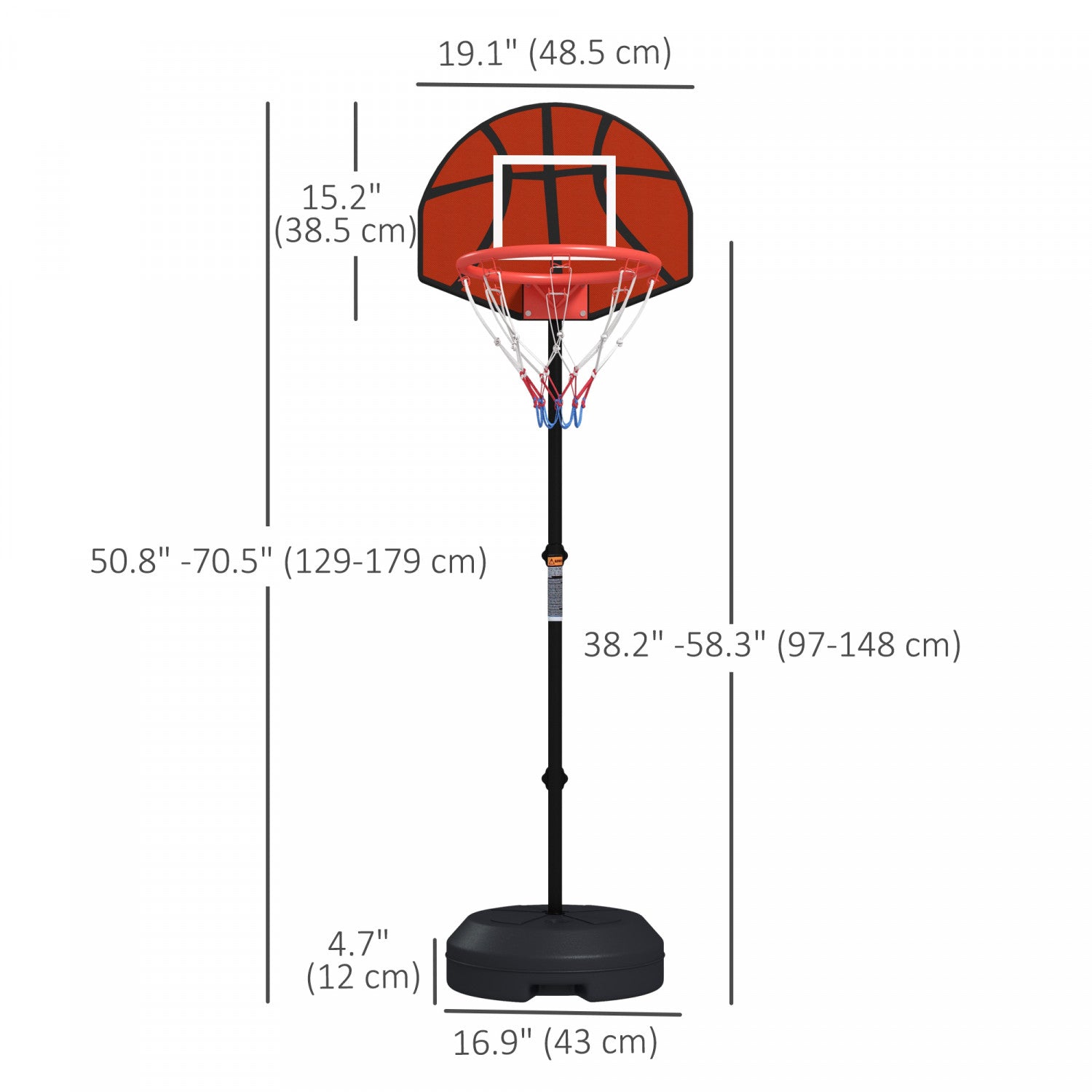 | Additional Information | - Colours: Black and Brown; - Materials: Steel, PE; - Backboard Size: 15.2" W x 19.1" H (38.5 x 48.5 cm); - Base Size: ⌀16.9" x 4.7" H (⌀43 x 12 cm); - Hoop Size: ⌀13.4" (⌀34 cm); - Overall Height: 50.8 "-70.5" (129-179 cm); - Basketball Hoop Height: 38.4 "-58.3" (97.5-148 cm); - Base Capacity: 31 lbs. (14 kg) of water, 40 lbs. (18 kg) of sand, or a maximum of 33 lbs. (15 kg) of water and sand; - Recommended Age: 6+; - Item Label: A61-054V00BK; |