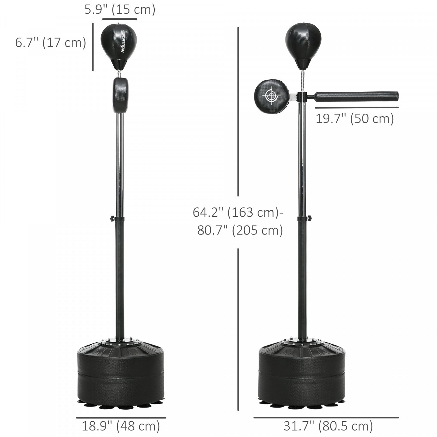 | Additional Information | - Colour: Black; - Materials: Steel, HDPE, PU; - Overall Dimensions: 31.7" L x 18.9" W x 64.2-80.7" H (80.5 x 48 x 163-205 cm); - Speed Ball Dimensions: 6'' Dia. x 6.75'' D (15 x 17 cm); - Reflex Bar Dimensions: 2.25'' Dia. x 17.75'' L (6 x 45 cm); - Punching Pad Dimensions: 7'' Dia. x 2.75'' D (18 x 7 cm); - Loading Capacity of Base: 66 lbs./30kg (Water), 77 lbs./35kg (Sand), 88 lbs./40kg (Sand / Water Mixture); - Item Label: A91-247V00BK; |