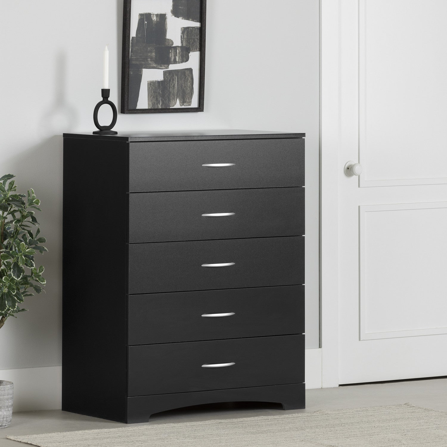 Contemporary lines and finish. This step one 5-drawer dresser has a timeless look and blends in easily with any decor. The contemporary lines are softened by the curved kick plate, and metal handles add character and value to the furniture. The neutral, modern style makes it suitable for men’s and women’s, providing plenty of storage space in this attractive piece of furniture. Practical storage and organization this bedroom furniture collection was designed just for tighter spaces! Featuring 5 practical drawers with metal handles, the dresser provides plenty of room for clothes, linens or general storage. The drawer slides are made of metal and include dampers and catches, creating a secure environment for babies and kids.