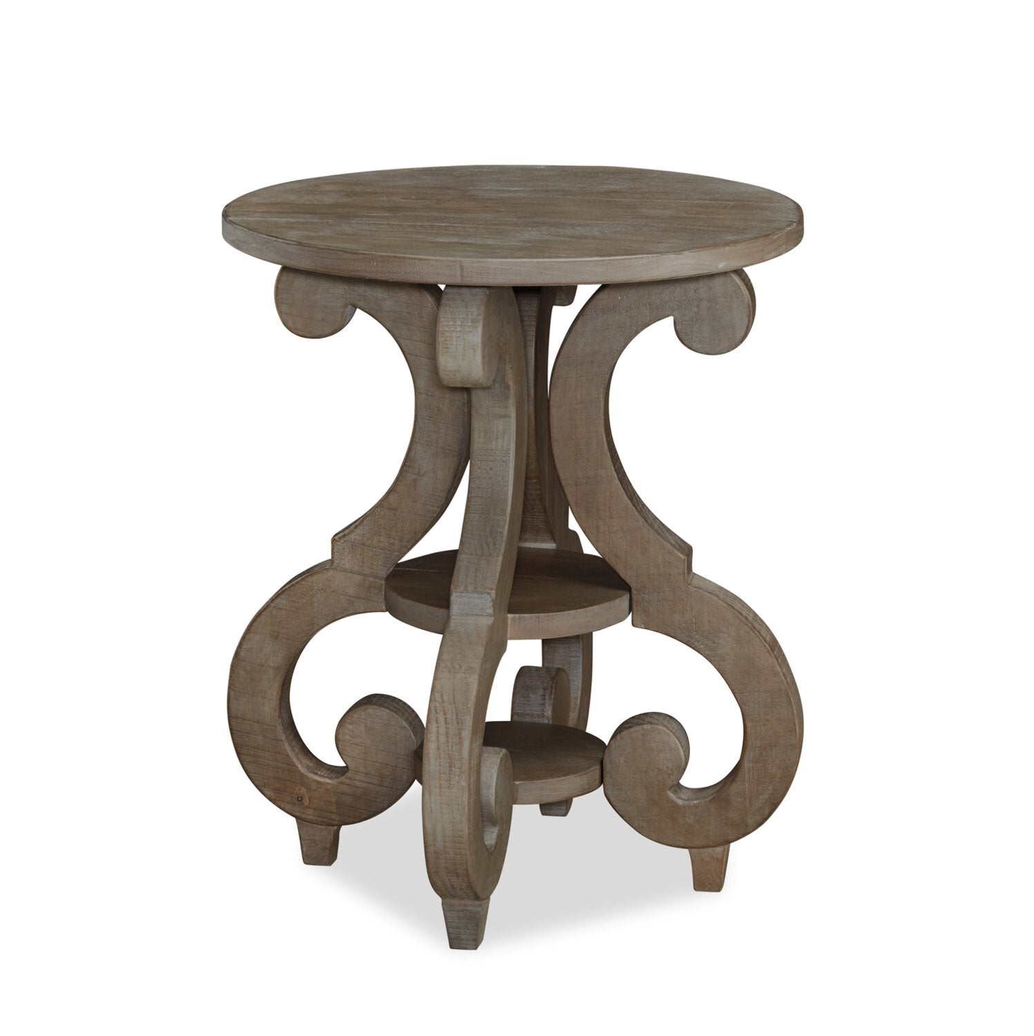 Tinley Park 22" Traditional Round End Table with Shelf - Grey-Brown Pine with Scroll Design Base
