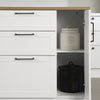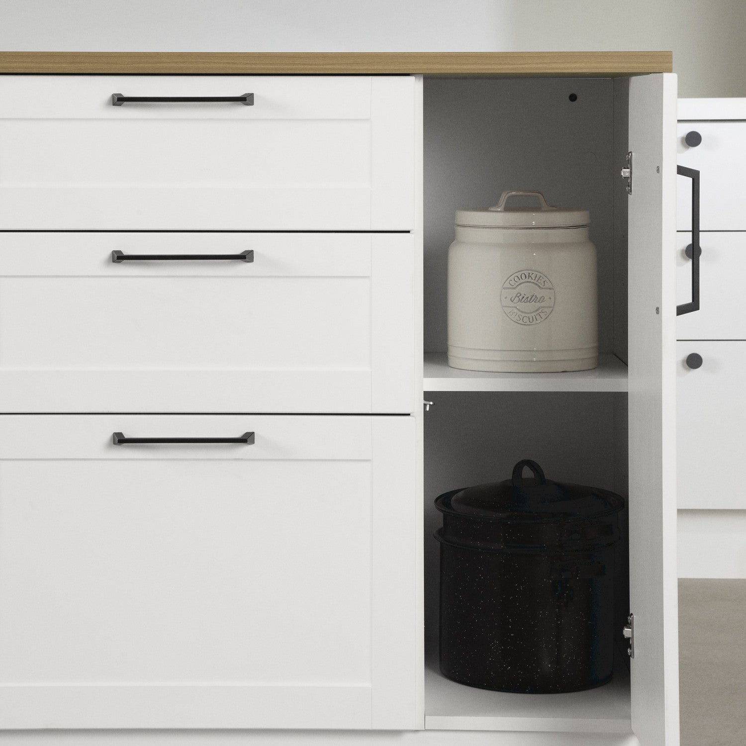 Looking for a simple, effective, and stylish way to make your kitchen more functional? Choose this kitchen island with 3 drawers of different sizes and a side cabinet with adjustable shelf. Store your utensils in the top drawer, your containers in the middle one and your pots and pans in the bottom one. To optimize your meal preparation experience, full-extension runners and reinforcements have been installed on each drawer. What's more, an integrated soft close mechanism makes closing smooth and pleasant to the ear. Take advantage of the water and scratch resistant melamine work surface to prepare your favorite recipes, make breakfast for the kids or bake your favorite cake. An easy-to-maintain piece of furniture that will fit right in with your everyday life! Versatility is the adjective that best describes this Farmhouse kitchen island! Its fine rustic accents, like its metal handles and framed doors, make it the ideal candidate for creating a highly trendy kitchen without undertaking major renovations. Place it in the center of the room or against a wall, as you wish. Depending on your needs, you can use it as a microwave cabinet or even as a coffee station. The possibilities are endless! The back of this piece of furniture features a faux door effect. So, no matter what angle you look at it from, the space will always feel cohesive.