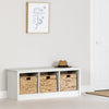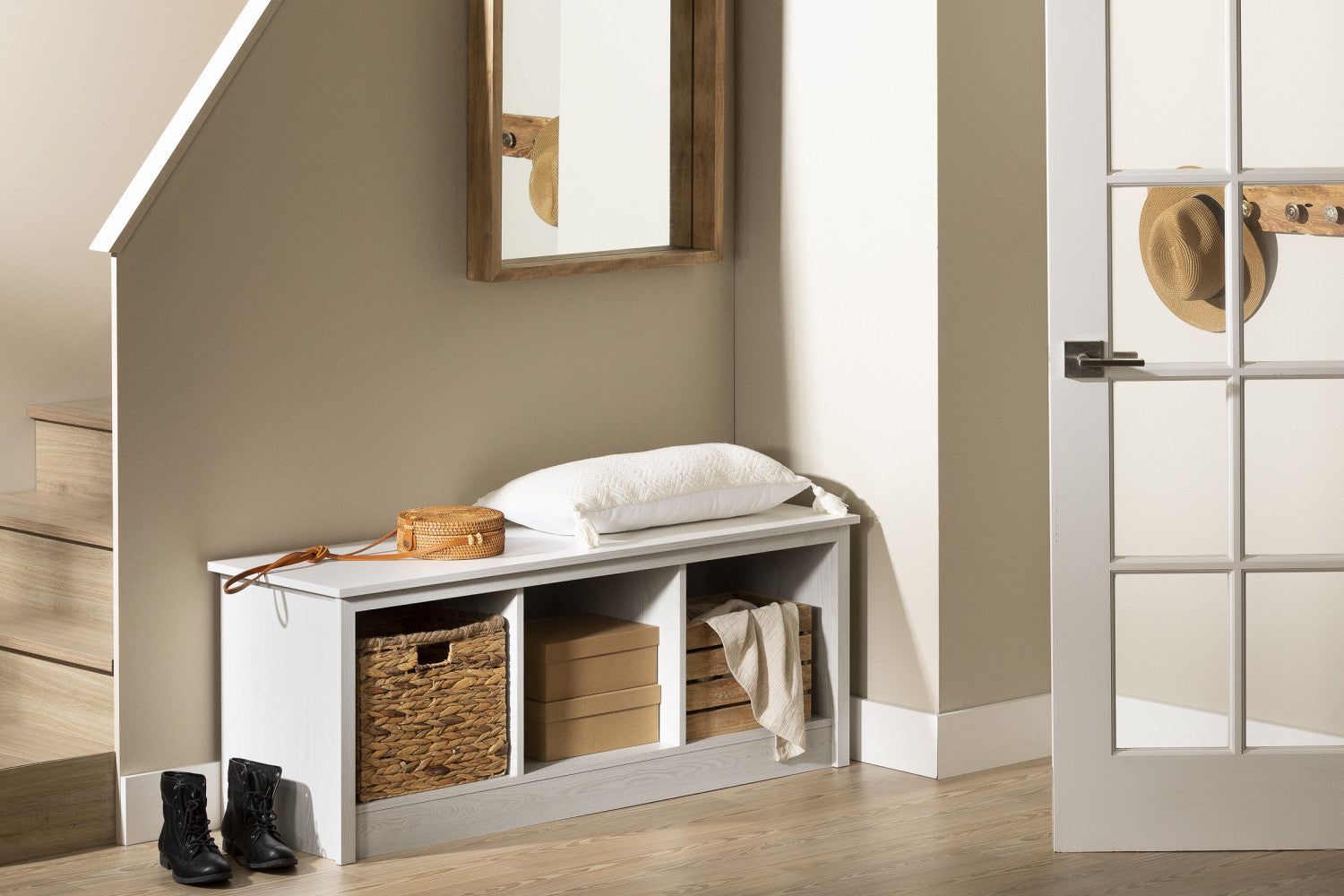 The Contemporary style of this mudroom bench will help create an inviting atmosphere in your home. The sleek design, with its open compartments and straight lines, will easily match your decor. Place baskets (not included) in the spaces under the seat and select original cushions for the top, to add a touch of originality. You’ll also have space on the wall above it for hooks or an inspiring work of art. Getting home will feel so good. Invite friends and family to your home and keep your entryway tidy with the help of this bench. Put slippers, or baskets filled with things for outdoor activities, in the three compartments under the seat. You could even label each basket with a family member’s name, to personalize your entryway. It’ll be so nice to have easy access to mittens, gloves, and scarves… without the mess.