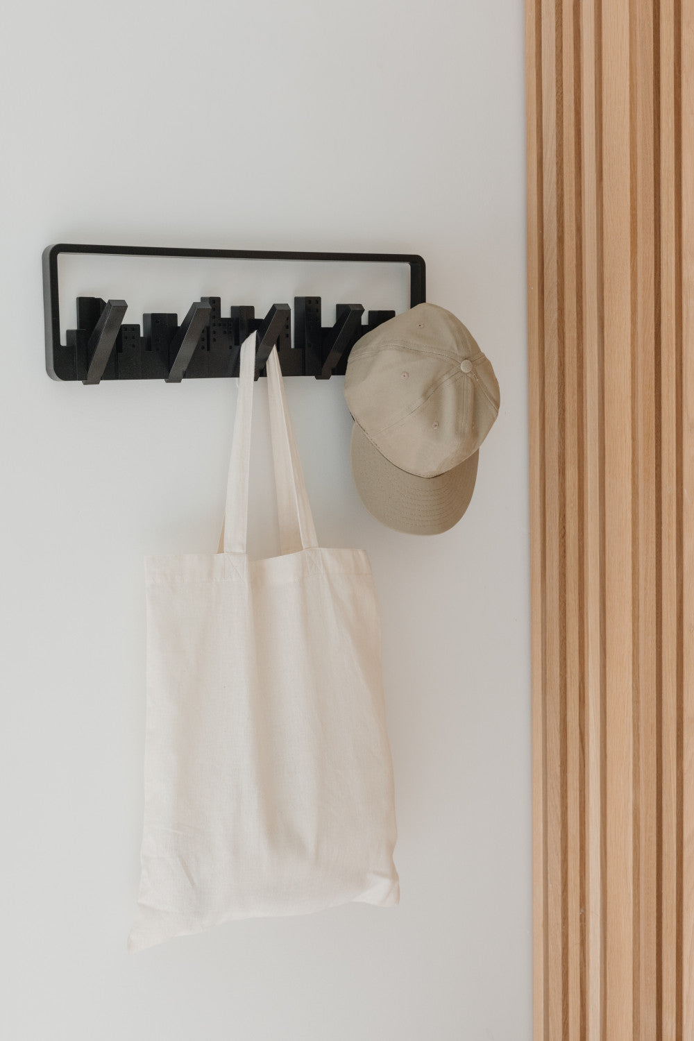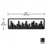 A piece of wall art that unexpectedly transforms into a collection of hooks that can be used for hanging scarves, accessories, bags and coats. This piece is designed to look like a window on a wall, with flip down hooks built into the skyline that hold up to 5 lb. each. Made with recycled plastics.